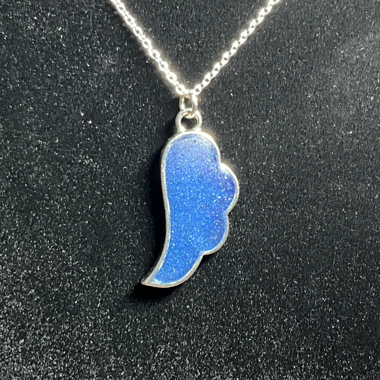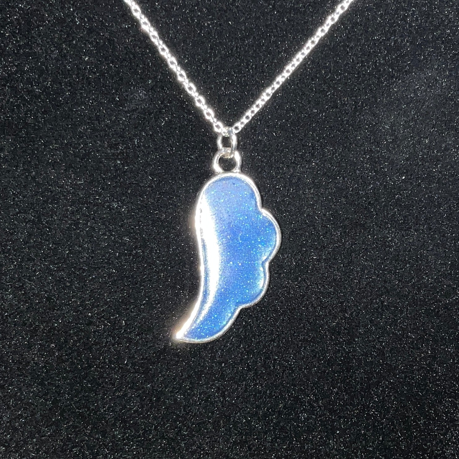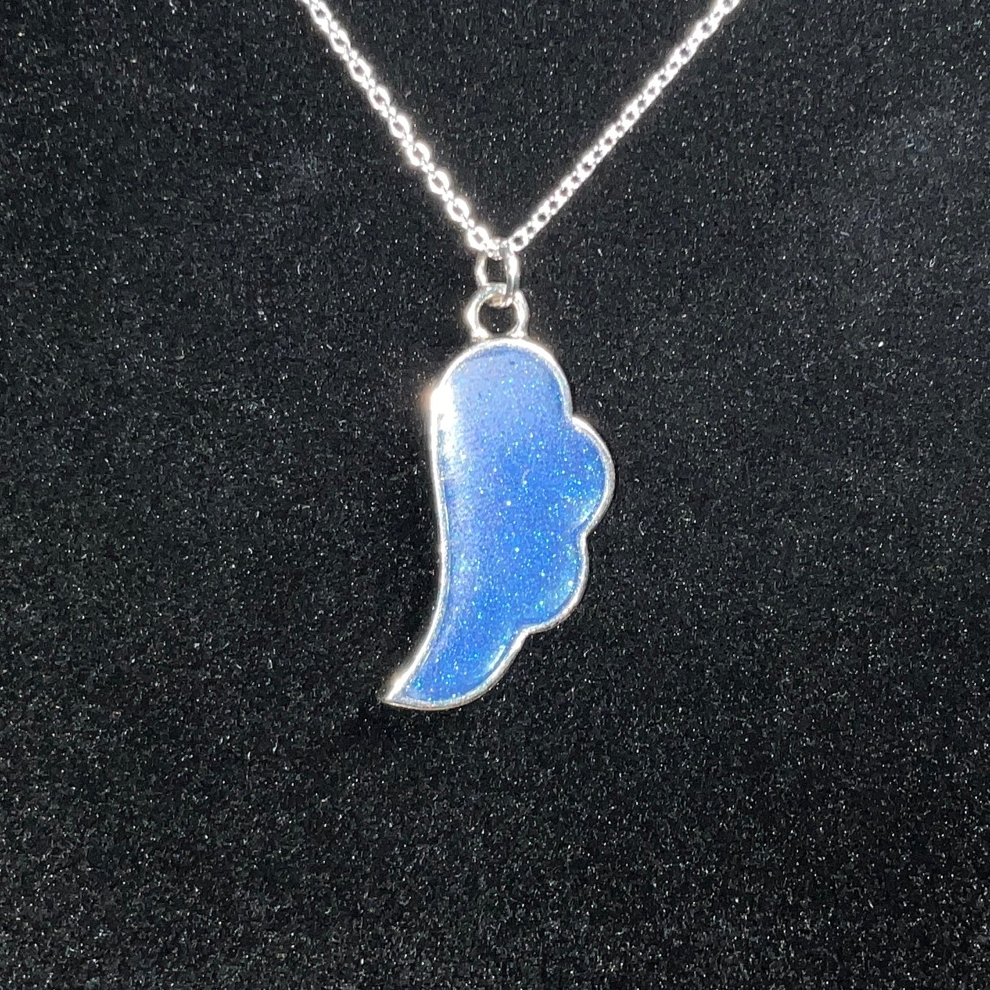 Embrace the beauty of grace and guidance with this handcrafted shimmery blue angel wing necklace. The pendant shimmers with blue hues that catch the light, reflecting a soft shimmer that feels both delicate and powerful. This elegant piece serves as a symbol of comfort, strength, and hope.