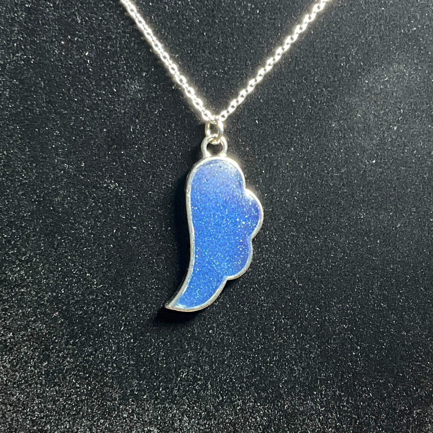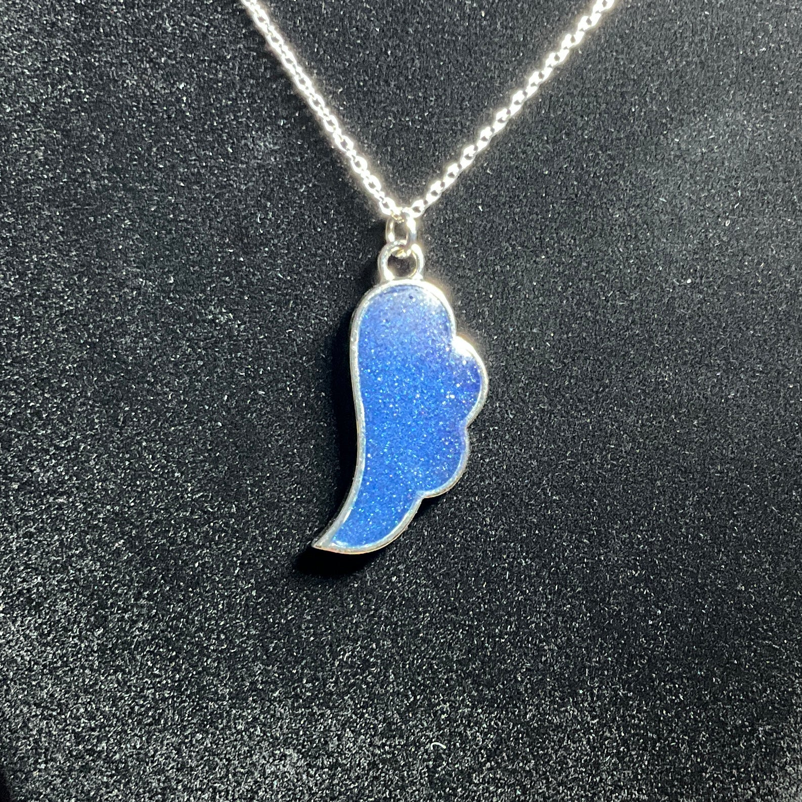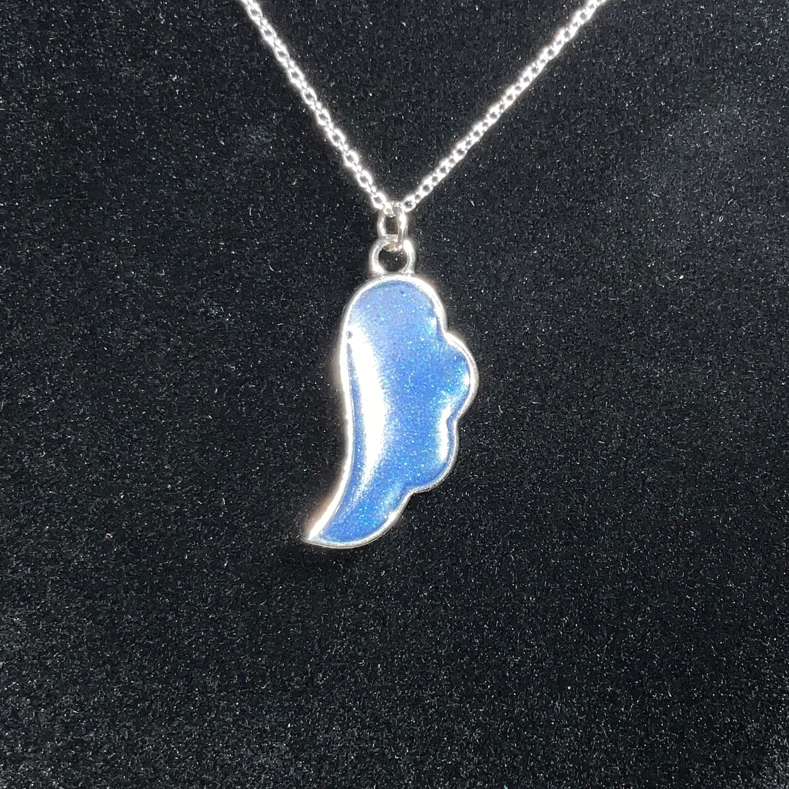 Embrace the beauty of grace and guidance with this handcrafted shimmery blue angel wing necklace. The pendant shimmers with blue hues that catch the light, reflecting a soft shimmer that feels both delicate and powerful. This elegant piece serves as a symbol of comfort, strength, and hope.