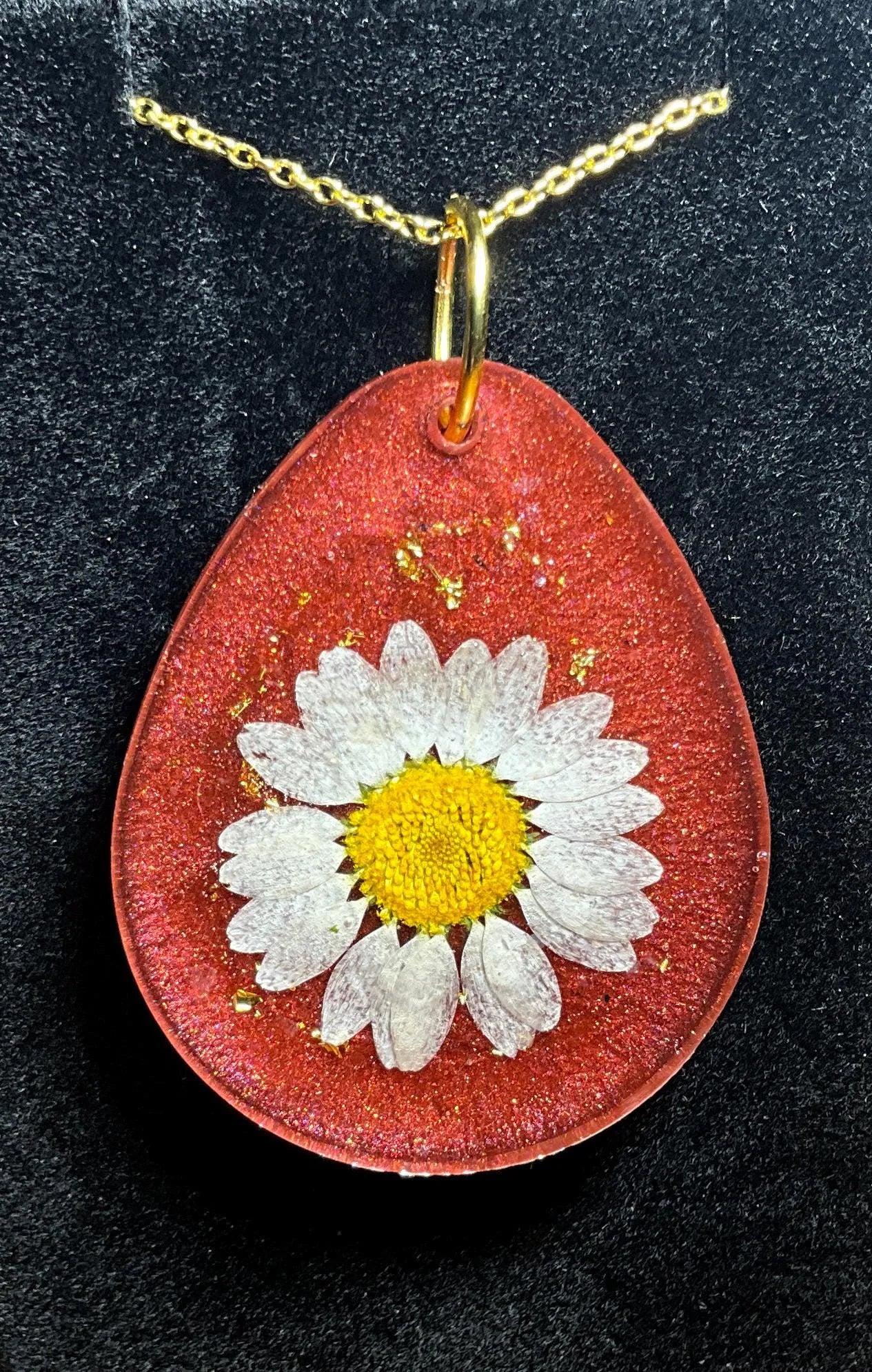 A delicate white daisy sits gracefully against a striking red background, accented by shimmering gold flecks. This bold design is perfect for adding a splash of color and charm to your ensemble.