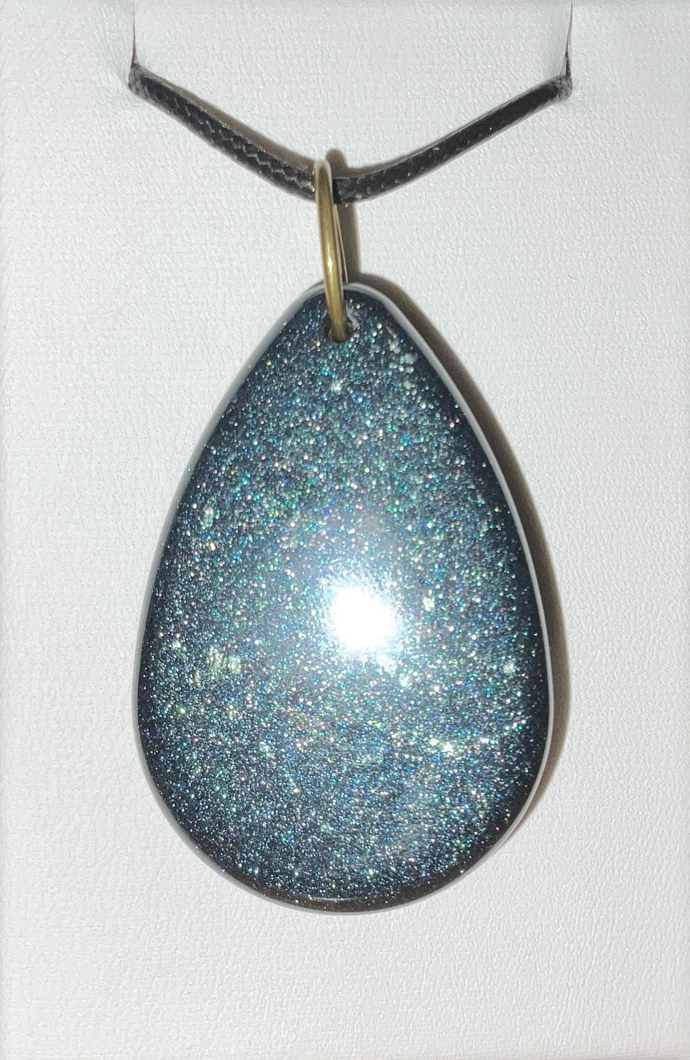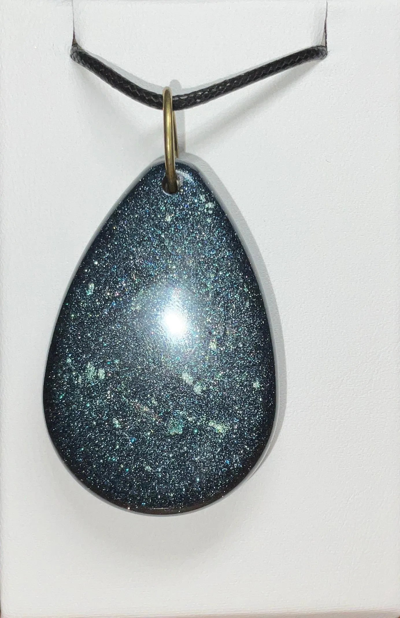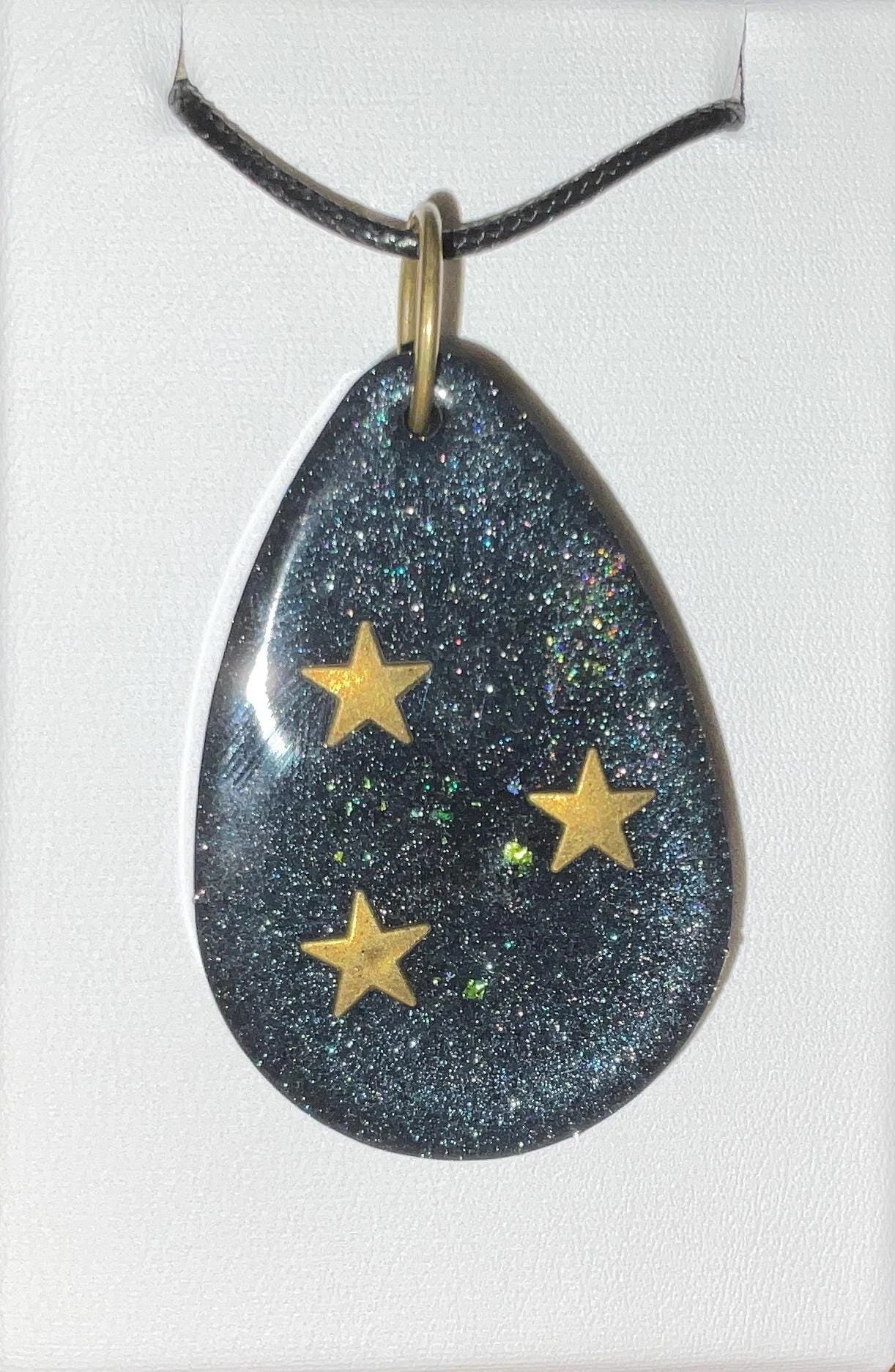 Add a touch of the cosmos to your style with this mesmerizing handmade necklace, designed to capture the wonder of the night sky. One side of the pendant features bronze stars resting on a deep, shimmering background – evoking the beauty of stargazing on a clear night. Flip it over to reveal a matching, glimmering surface infused with Color-Shift pigments that subtly shift and dance with changes in light and angle, adding an ever-changing, magical quality.