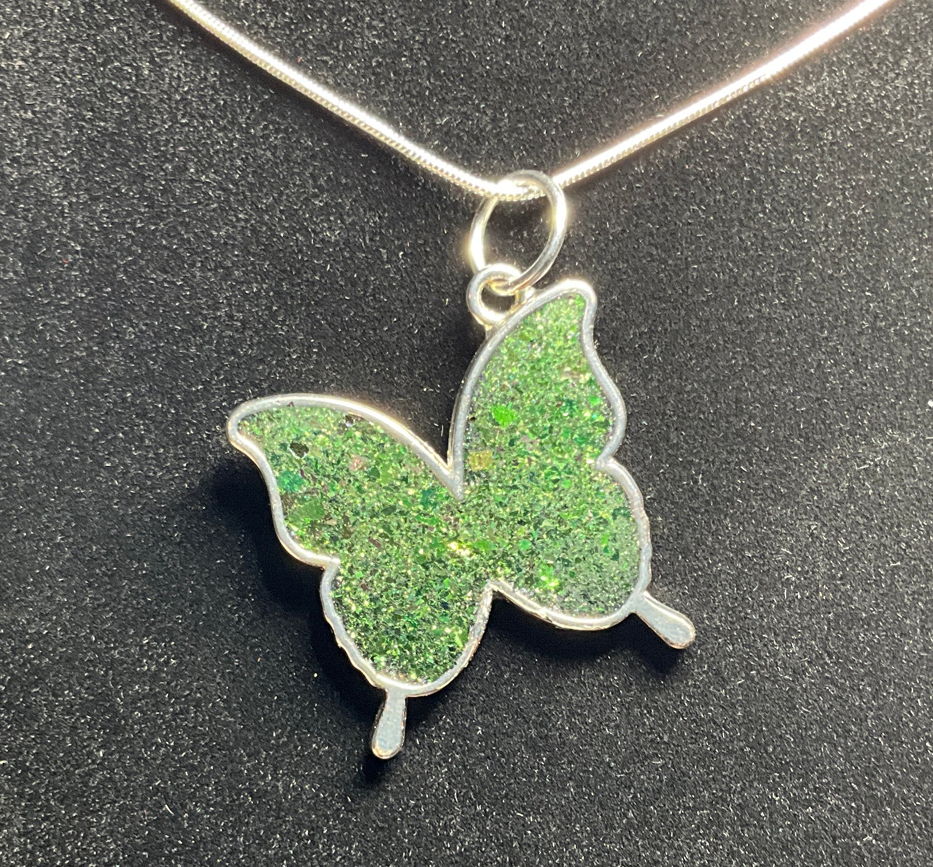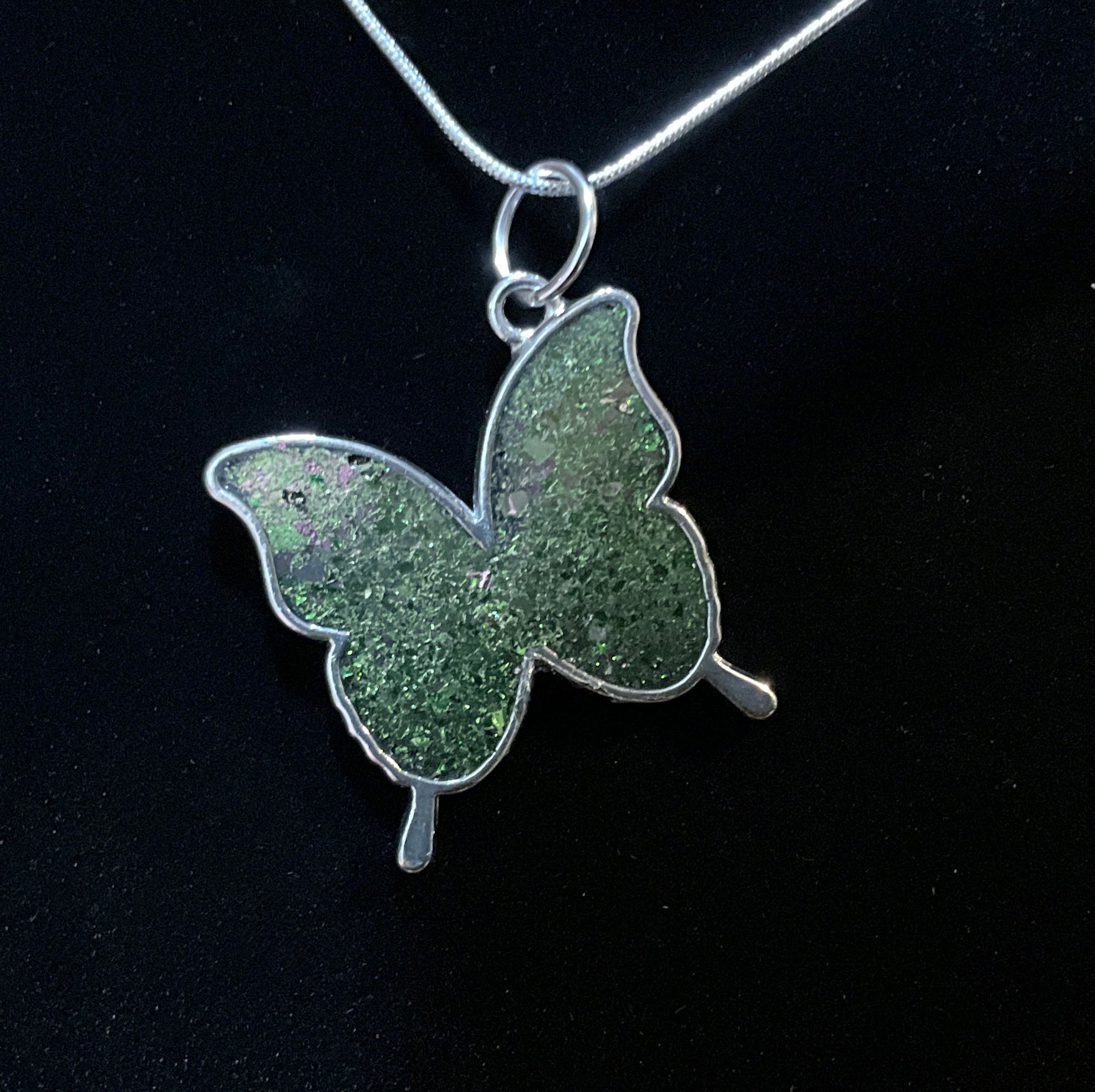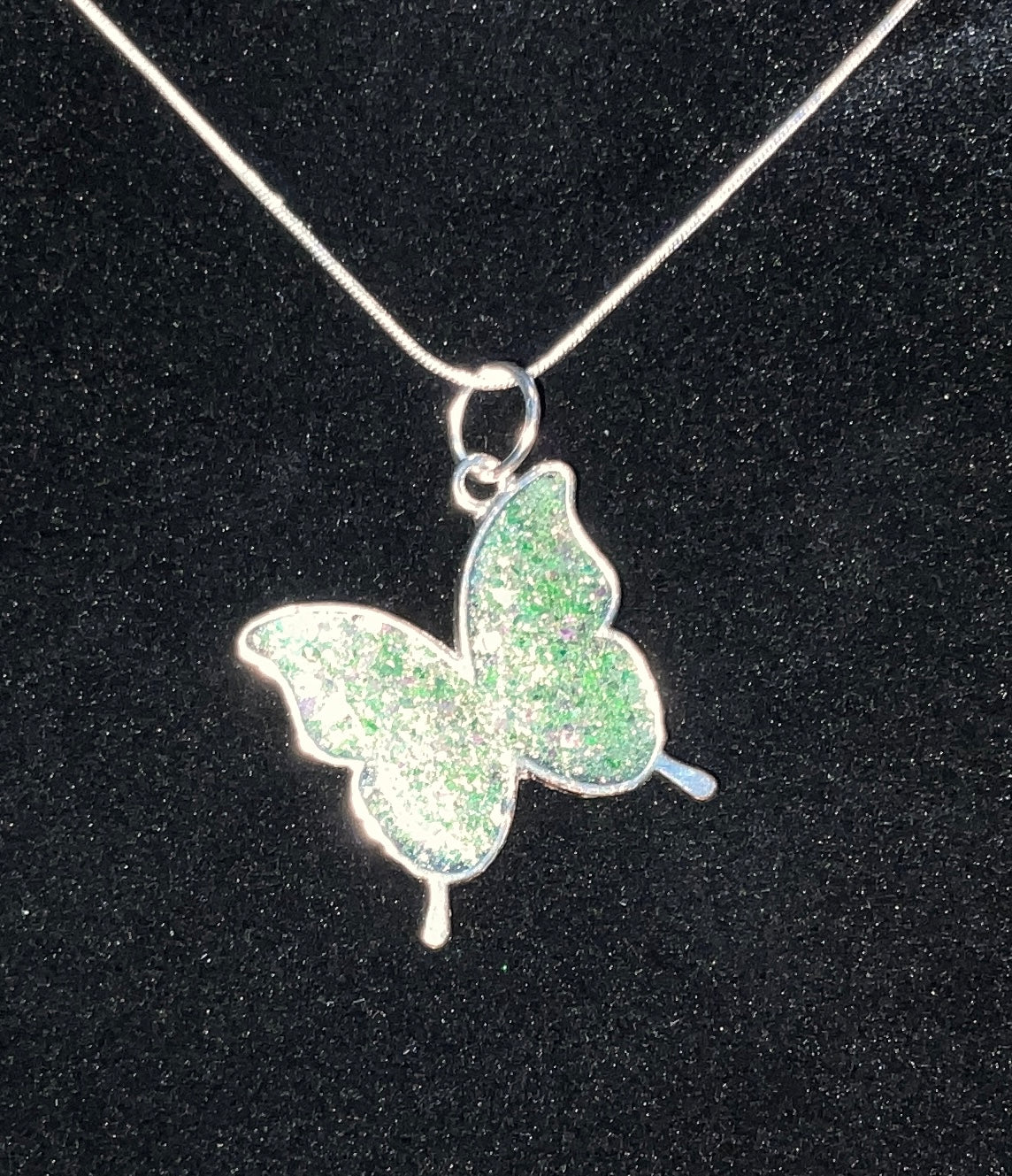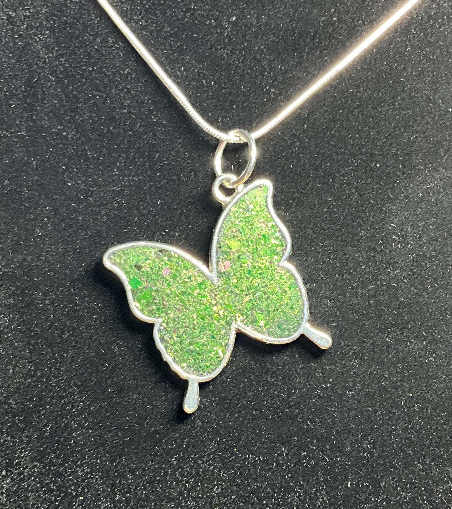 Let nature’s brilliance flutter into your style with this dazzling handmade glittery green butterfly necklace. This eye-catching pendant shimmers and shifts with the light, revealing enchanting shades of blue and purple as it moves. Crafted with mesmerizing color-shift pigment, the butterfly pendant dances between colors, making it a truly dynamic and magical accessory.