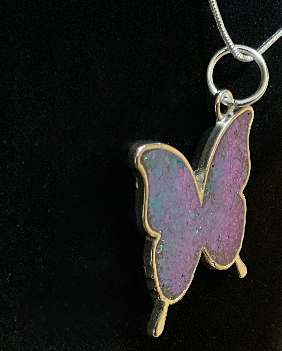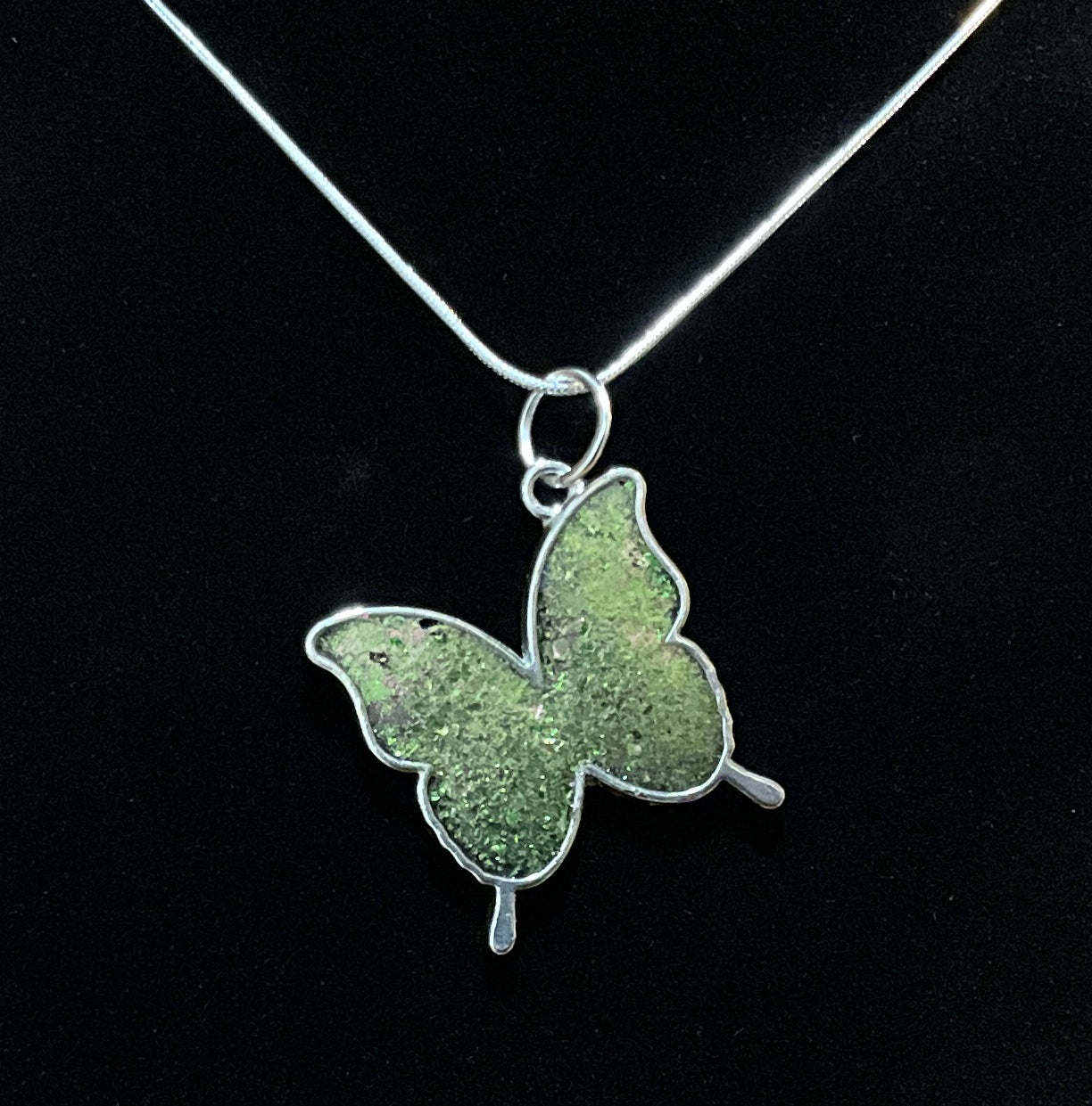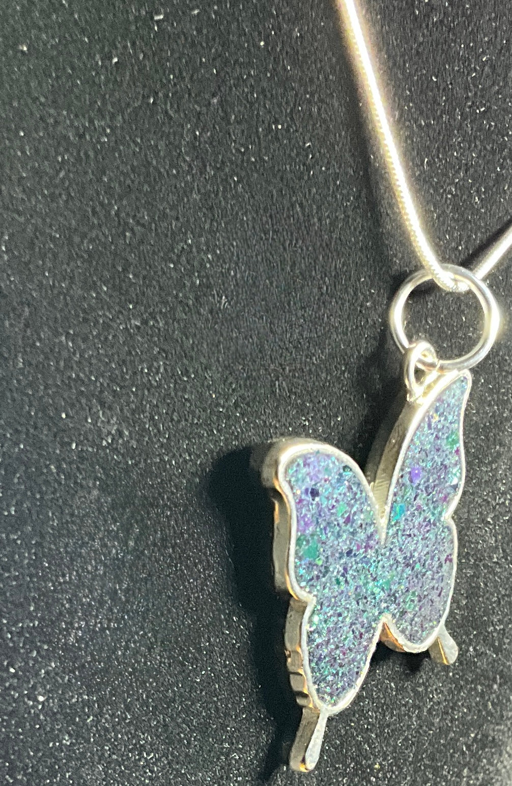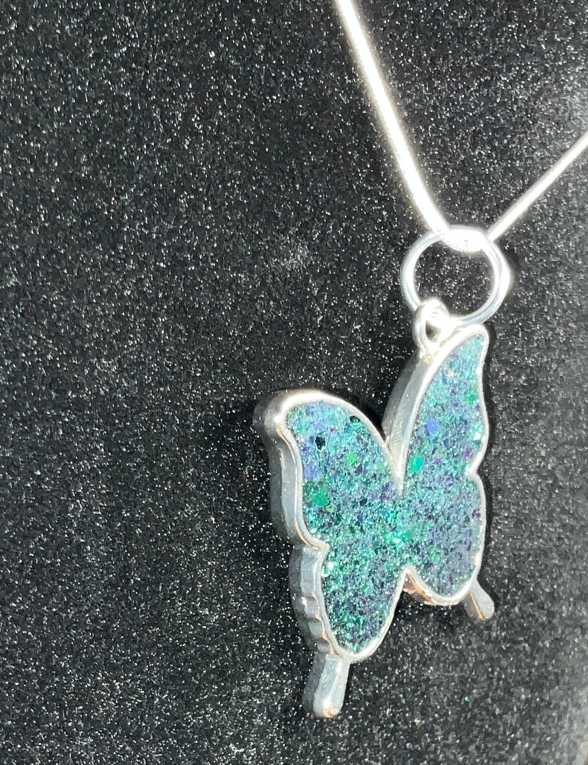 Let nature’s brilliance flutter into your style with this dazzling handmade glittery green butterfly necklace. This eye-catching pendant shimmers and shifts with the light, revealing enchanting shades of blue and purple as it moves. Crafted with mesmerizing color-shift pigment, the butterfly pendant dances between colors, making it a truly dynamic and magical accessory.