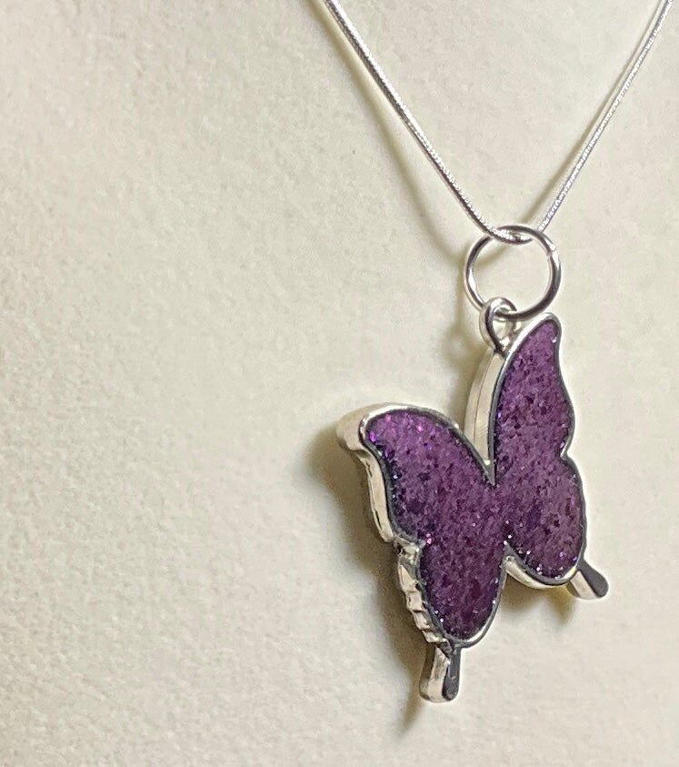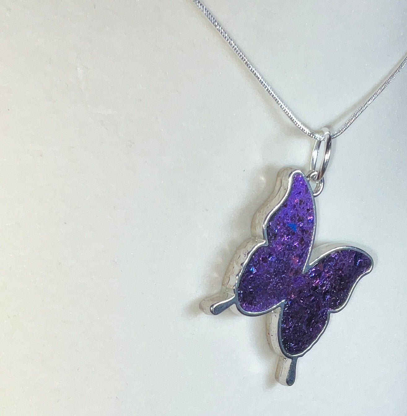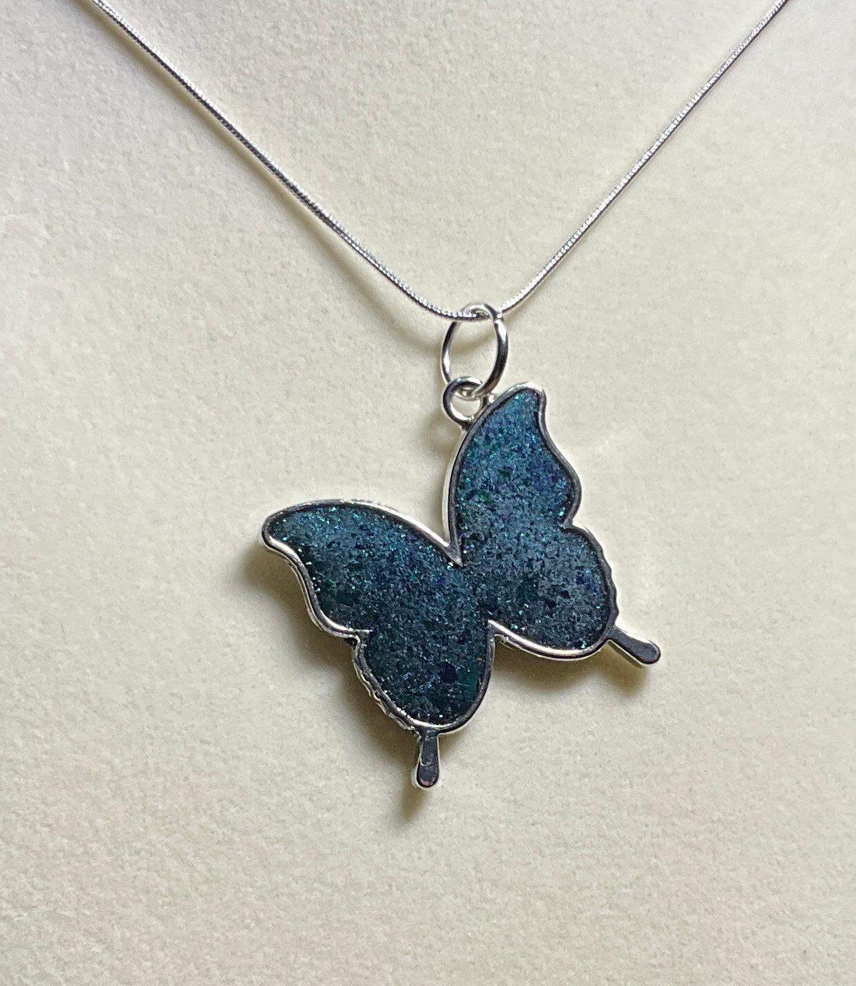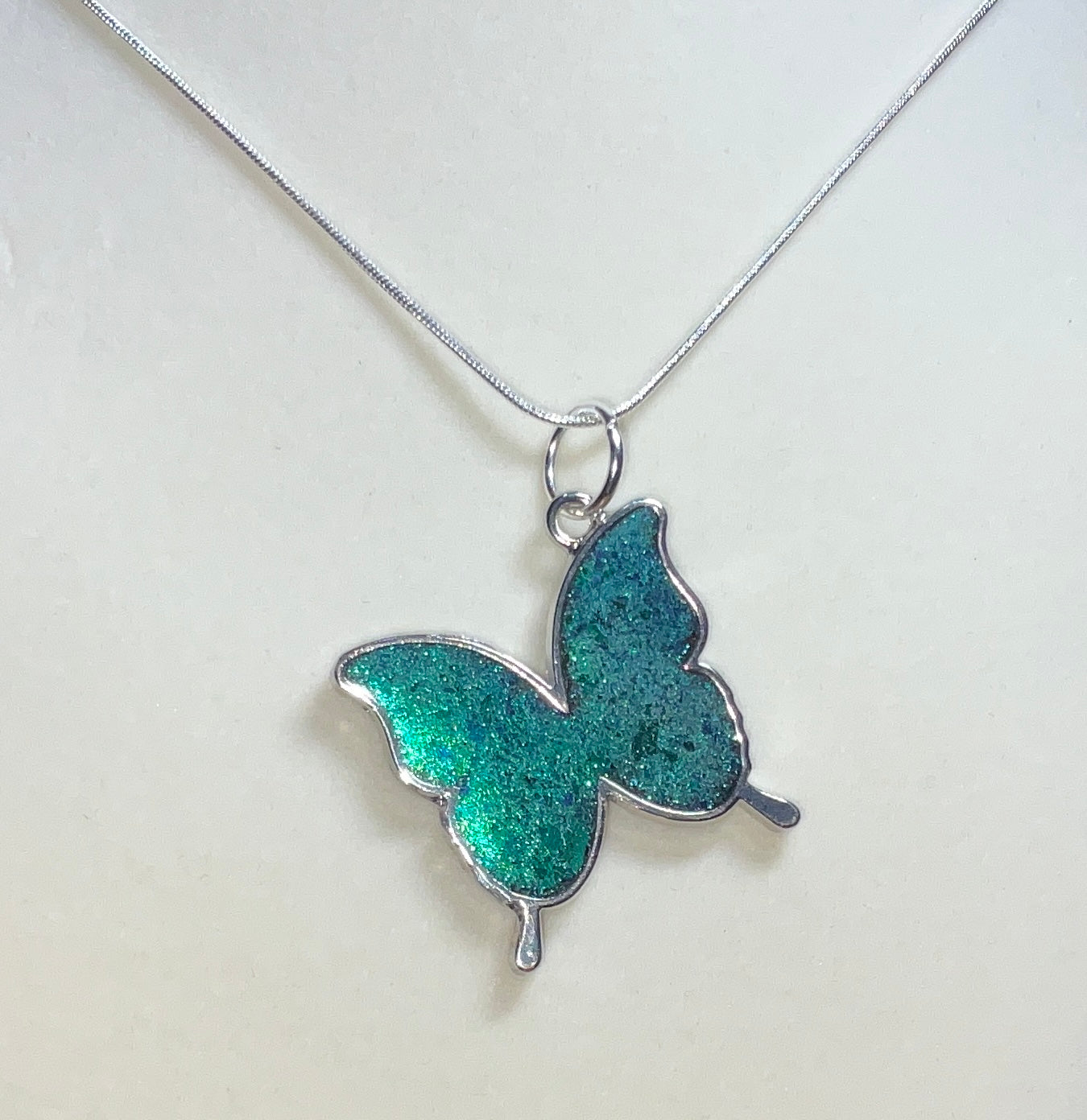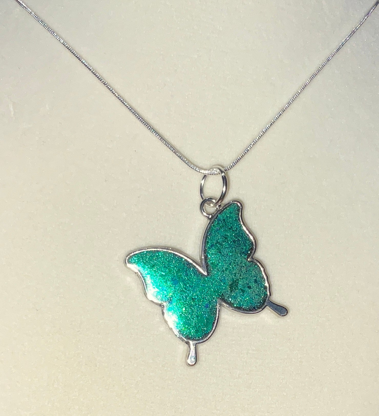 Elevate your style with the radiant charm of this handmade glittery green butterfly necklace. Designed to capture the light, the shimmering butterfly pendant sparkles with every movement, creating a stunning display that adds a magical touch to any outfit. Crafted with mesmerizing color-shift pigment, this unique pendant shifts to a rich purple hue when viewed from the side, creating an enchanting interplay of color and light.