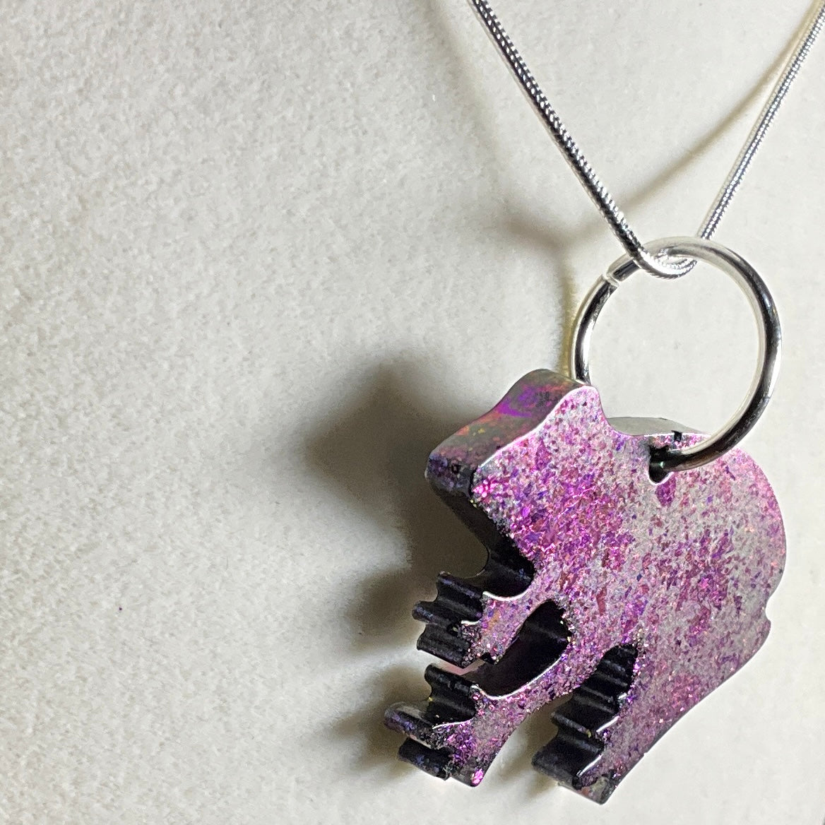 Watch as the pendant transforms between hues of green, purple, and pink, offering a captivating display that shifts with light and movement.