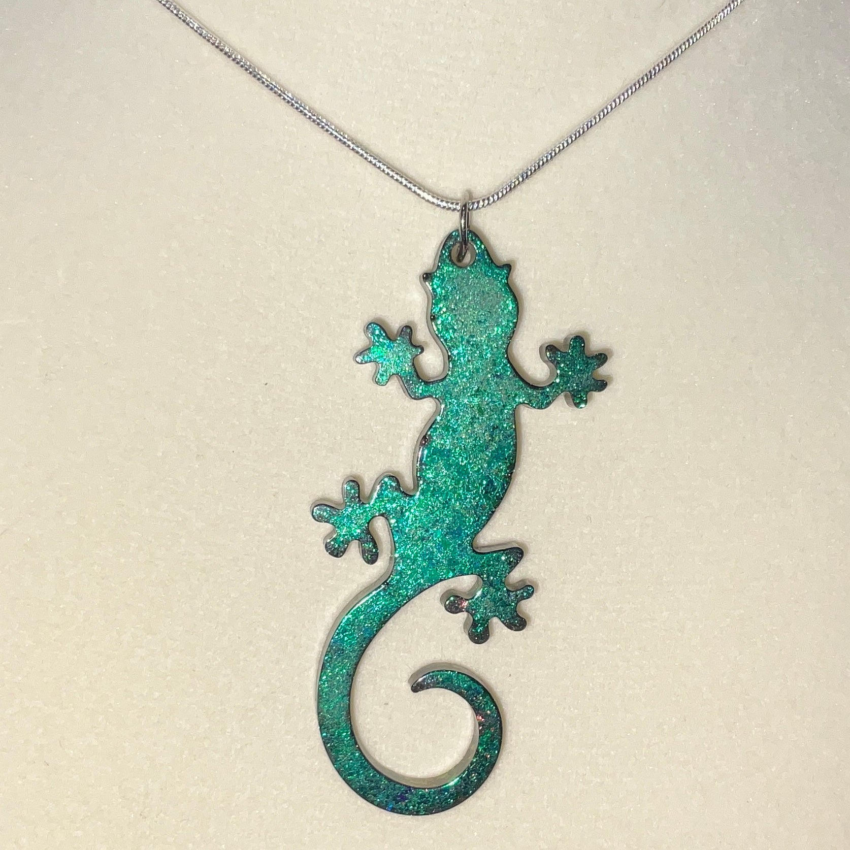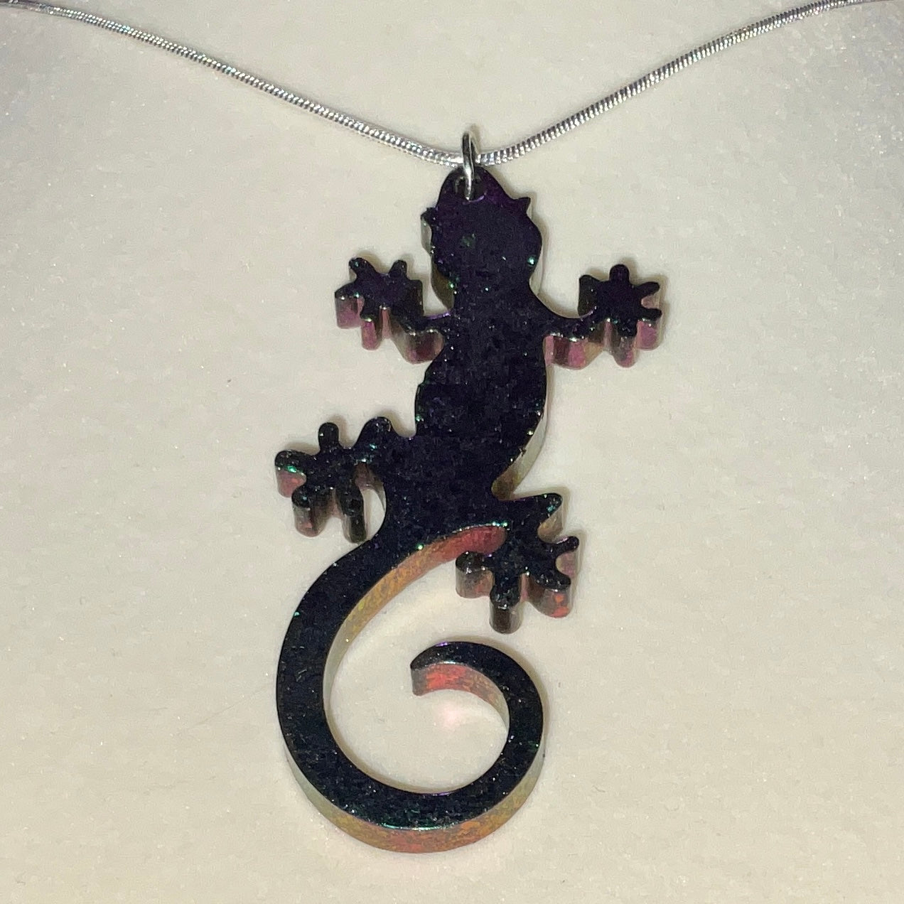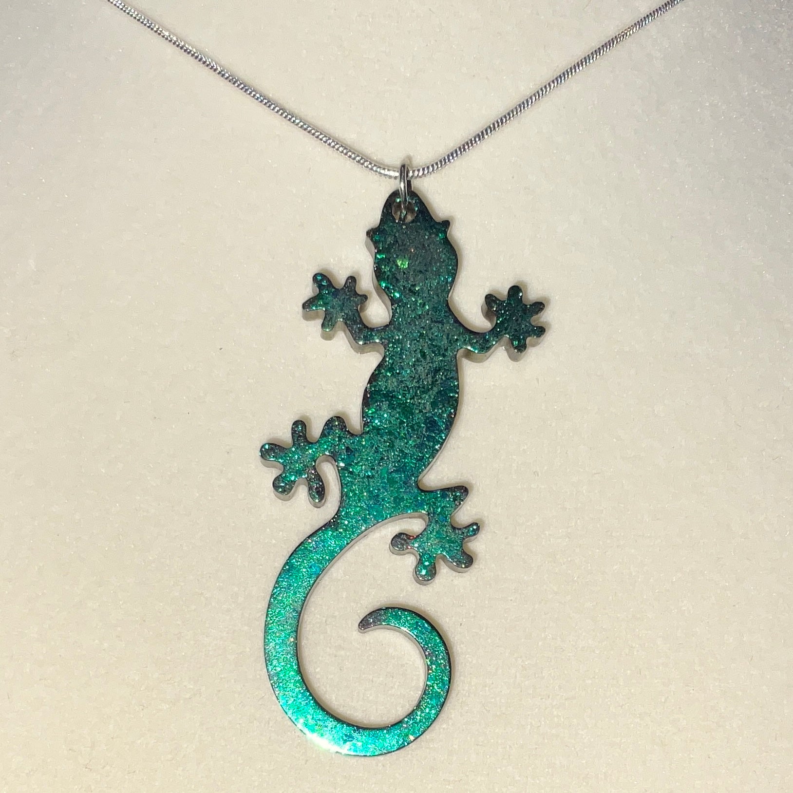Bring a spark of nature’s wonder to your look with this striking handmade lizard necklace. This enchanting pendant shimmers with a captivating color-shift effect, transitioning from green to purple depending on the light and angle. The sleek, detailed design captures the graceful form of the lizard, making it a unique and eye-catching accessory for any outfit.