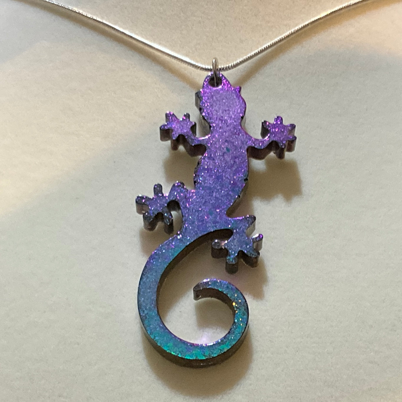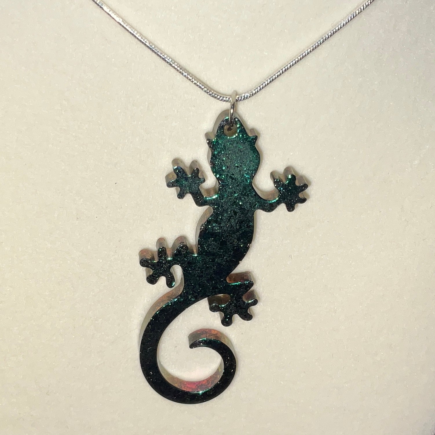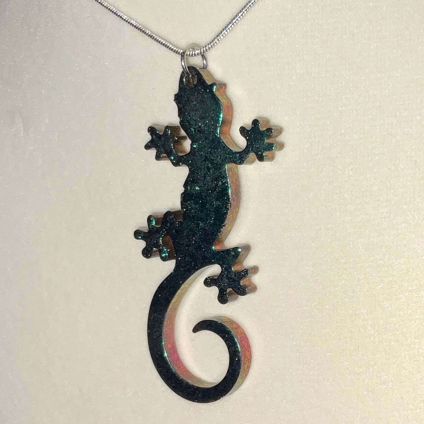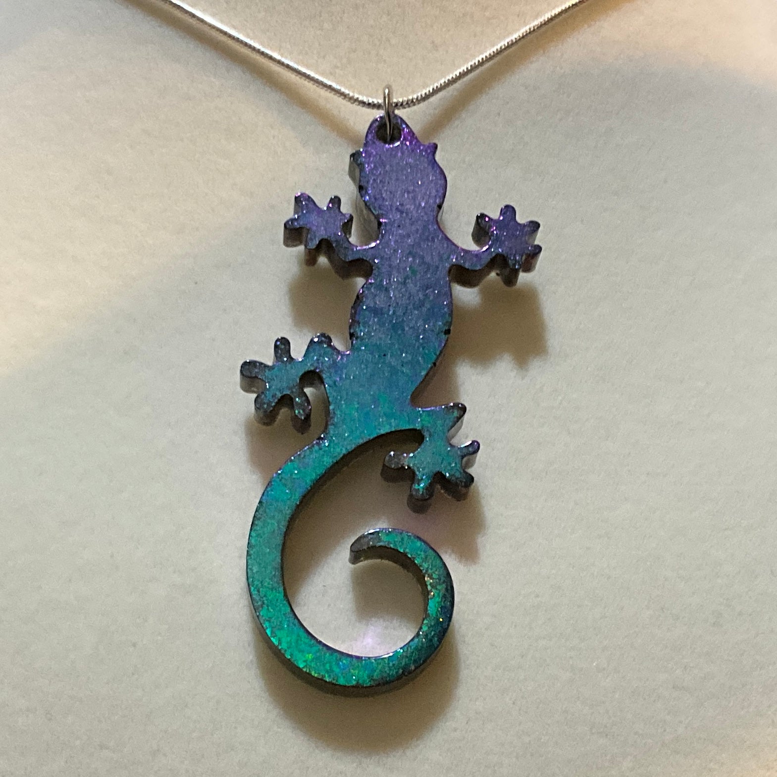 Bring a spark of nature’s wonder to your look with this striking handmade lizard necklace. This enchanting pendant shimmers with a captivating color-shift effect, transitioning from green to purple depending on the light and angle. The sleek, detailed design captures the graceful form of the lizard, making it a unique and eye-catching accessory for any outfit.