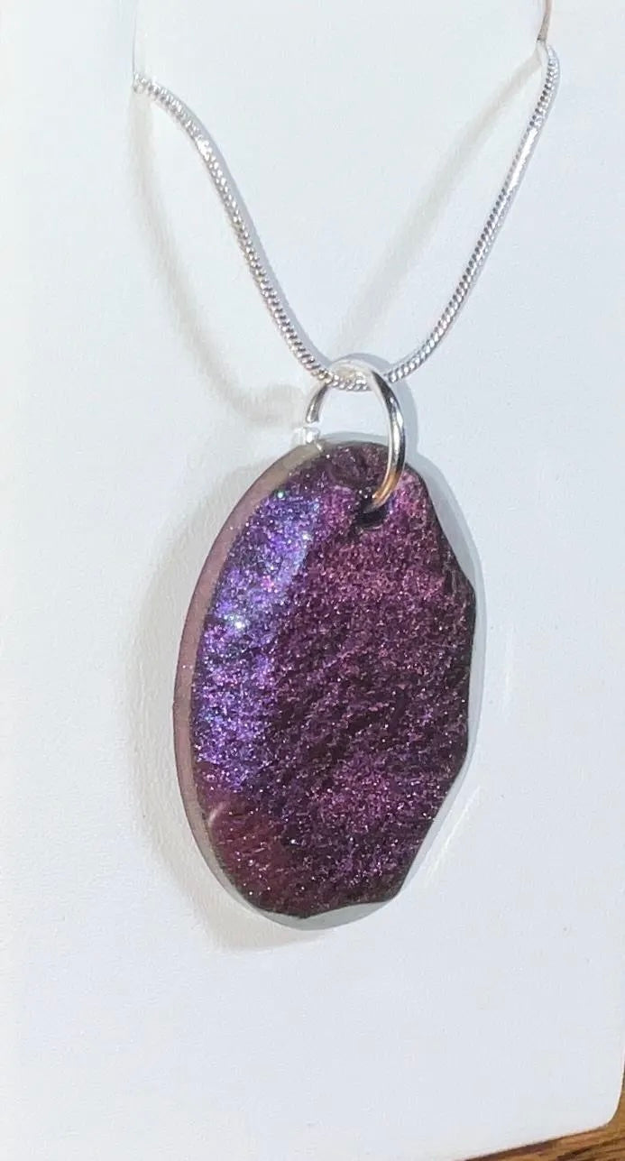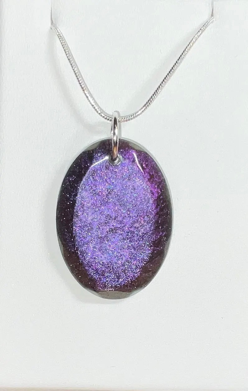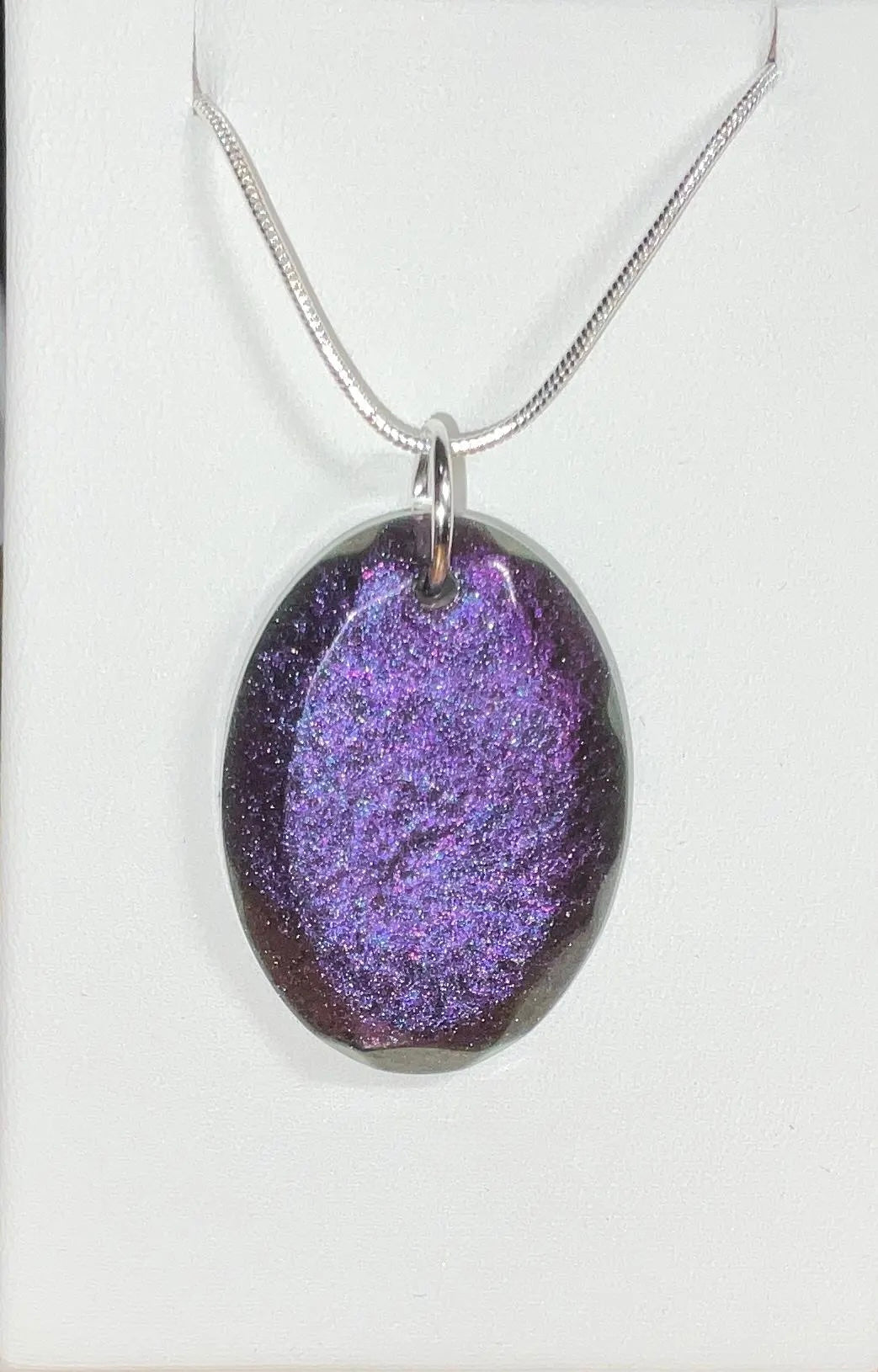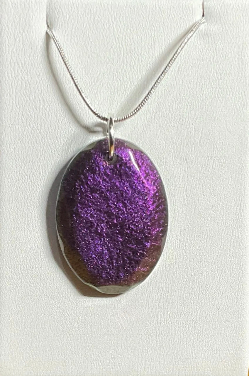 Add a touch of magic to your style with this captivating handmade oval-shaped color-shift necklace. Crafted with mesmerizing Chameleon Color-Shift pigment, the pendant gracefully shifts through rich shades of purple as it catches the light from different angles. This enchanting effect creates a dynamic and eye-catching accessory that brings life and vibrancy to any outfit – whether you're dressing up or keeping it casual.
