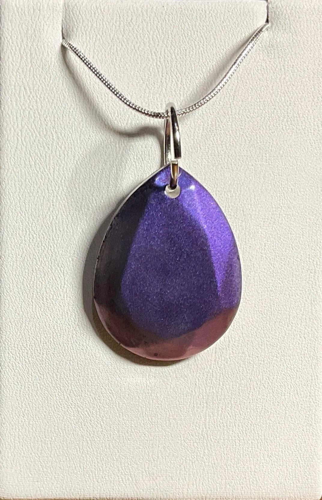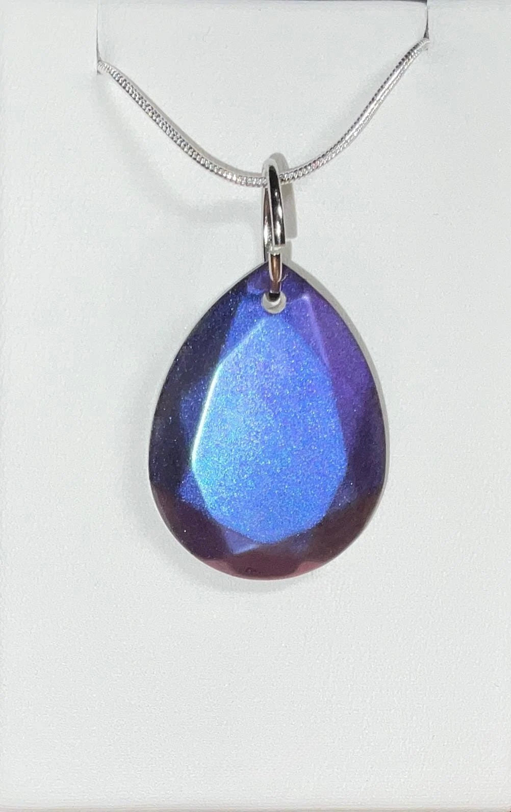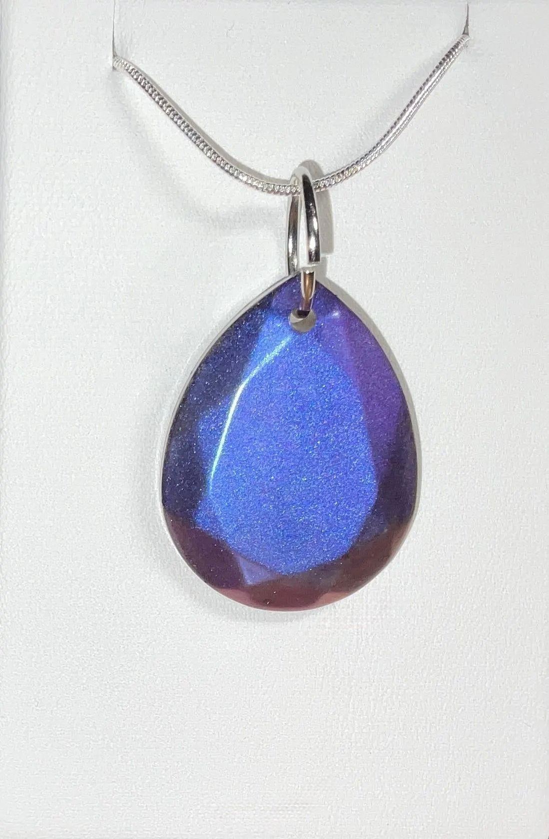 Add a splash of magic to your style with this enchanting handmade teardrop-shaped color-shift necklace. Crafted with premium Chameleon Color-Shift pigment, the pendant shimmers and shifts effortlessly between vibrant purples and deep blues, with subtle hints of pink flickering through as the light catches it from different angles. This mesmerizing effect makes the necklace a stunning focal point, perfect for bringing a dynamic and playful elegance to any outfit.