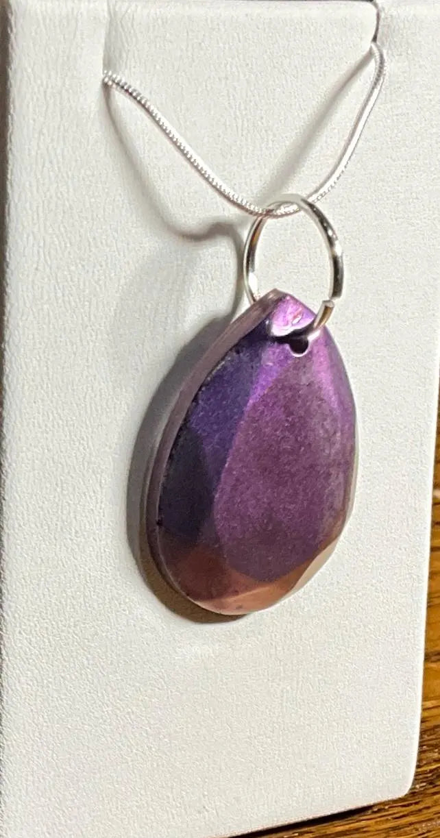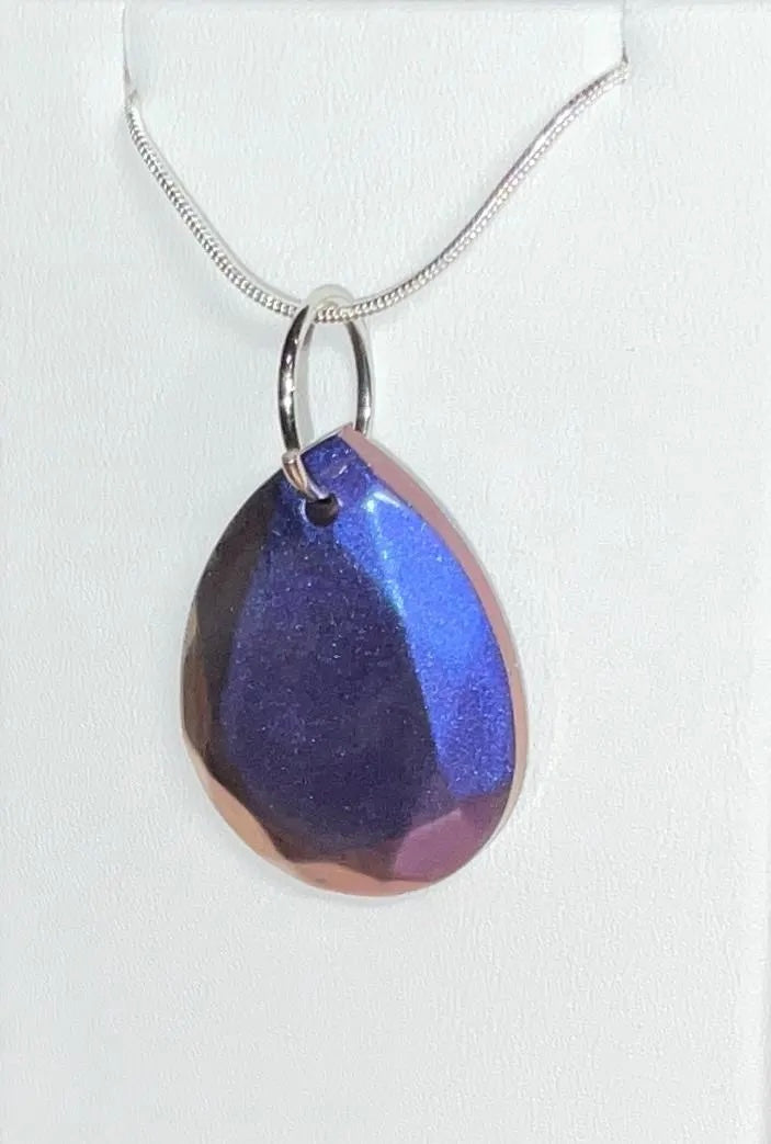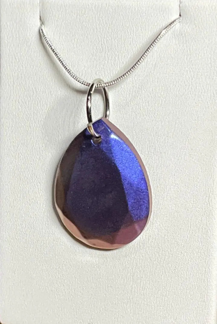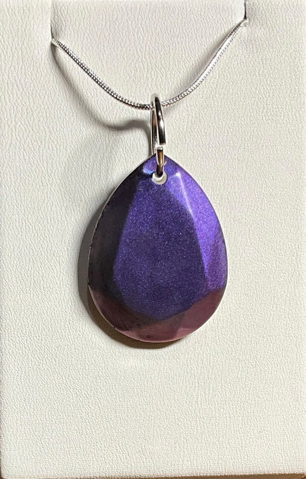 Add a splash of magic to your style with this enchanting handmade teardrop-shaped color-shift necklace. Crafted with premium Chameleon Color-Shift pigment, the pendant shimmers and shifts effortlessly between vibrant purples and deep blues, with subtle hints of pink flickering through as the light catches it from different angles. This mesmerizing effect makes the necklace a stunning focal point, perfect for bringing a dynamic and playful elegance to any outfit.