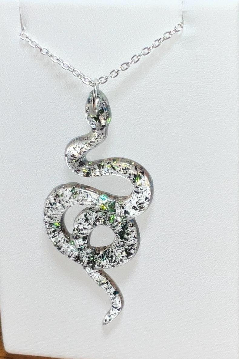 Add a touch of intrigue and enchantment to your style with this captivating handmade snake necklace. Crafted from clear resin and infused with mesmerizing chameleon color-shift pigment, this pendant shimmers and shifts between vibrant green, yellow, and subtle hints of blue – creating a dynamic, ever-changing display depending on the angle and light. Each turn reveals new depths of color, making this necklace a true showstopper and a stunning addition to any jewelry collection.