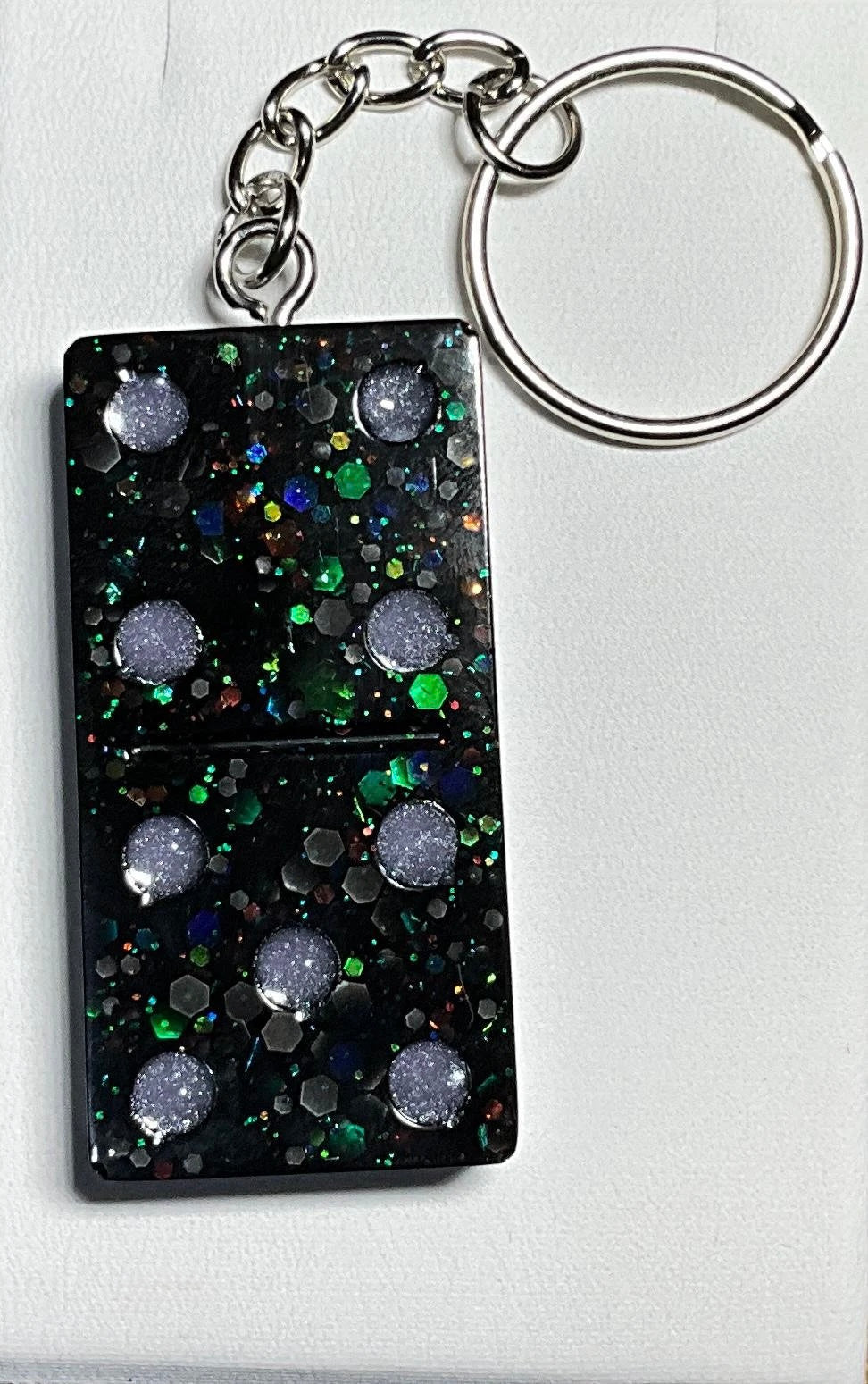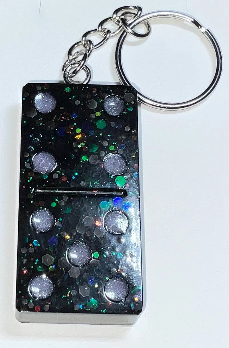 Measuring approximately 1” x 2” x 0.375”, this glittery domino keychain shines during the day and glows brilliantly at night, making it both functional and a statement piece. It’s perfect for game enthusiasts, night owls, and anyone who loves to add a little sparkle and personality to their accessories.