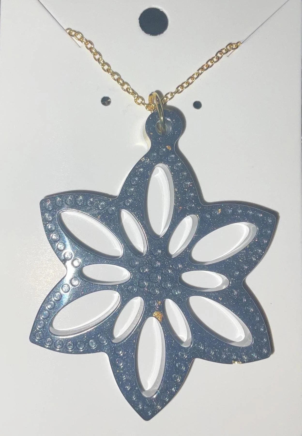 Elevate your style with this exquisitely crafted flower pendant necklace, designed to add a touch of refined beauty to any outfit. The pendant features a dark gray base, delicately speckled with shimmering gold flecks, and encased in a sleek gold chrome border. This striking contrast of textures and tones creates a bold yet graceful accessory that effortlessly transitions from casual to formal wear.