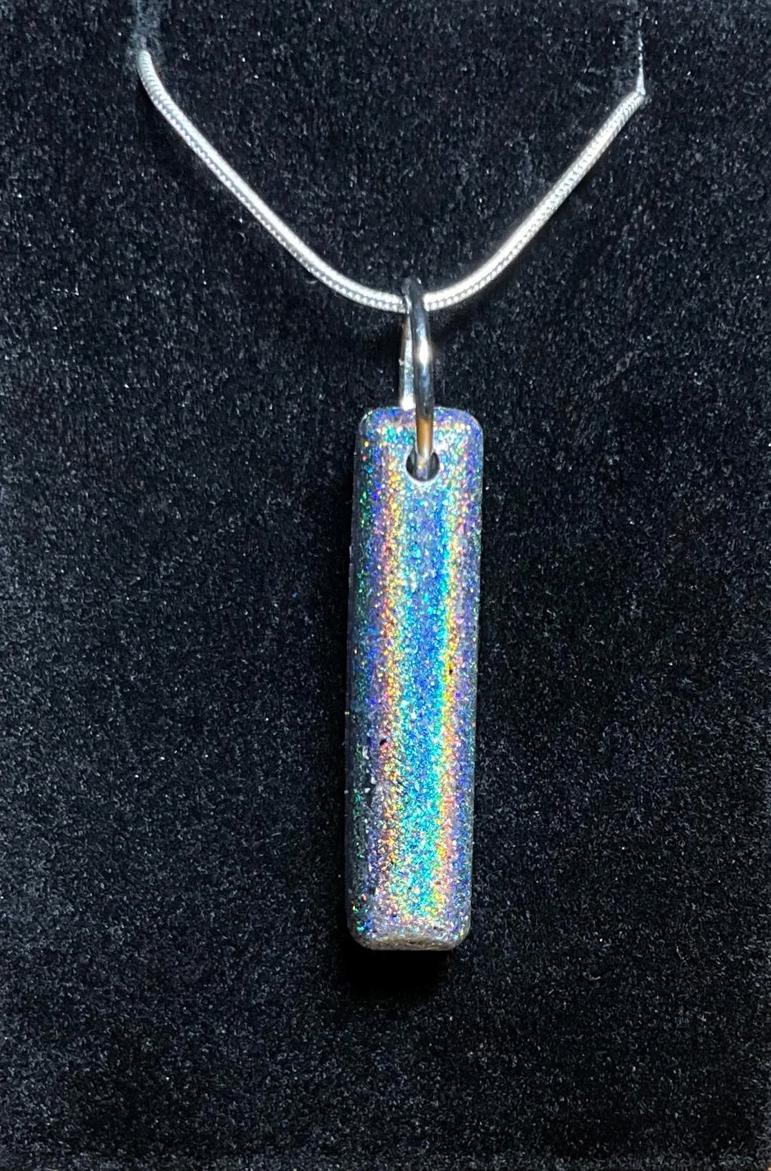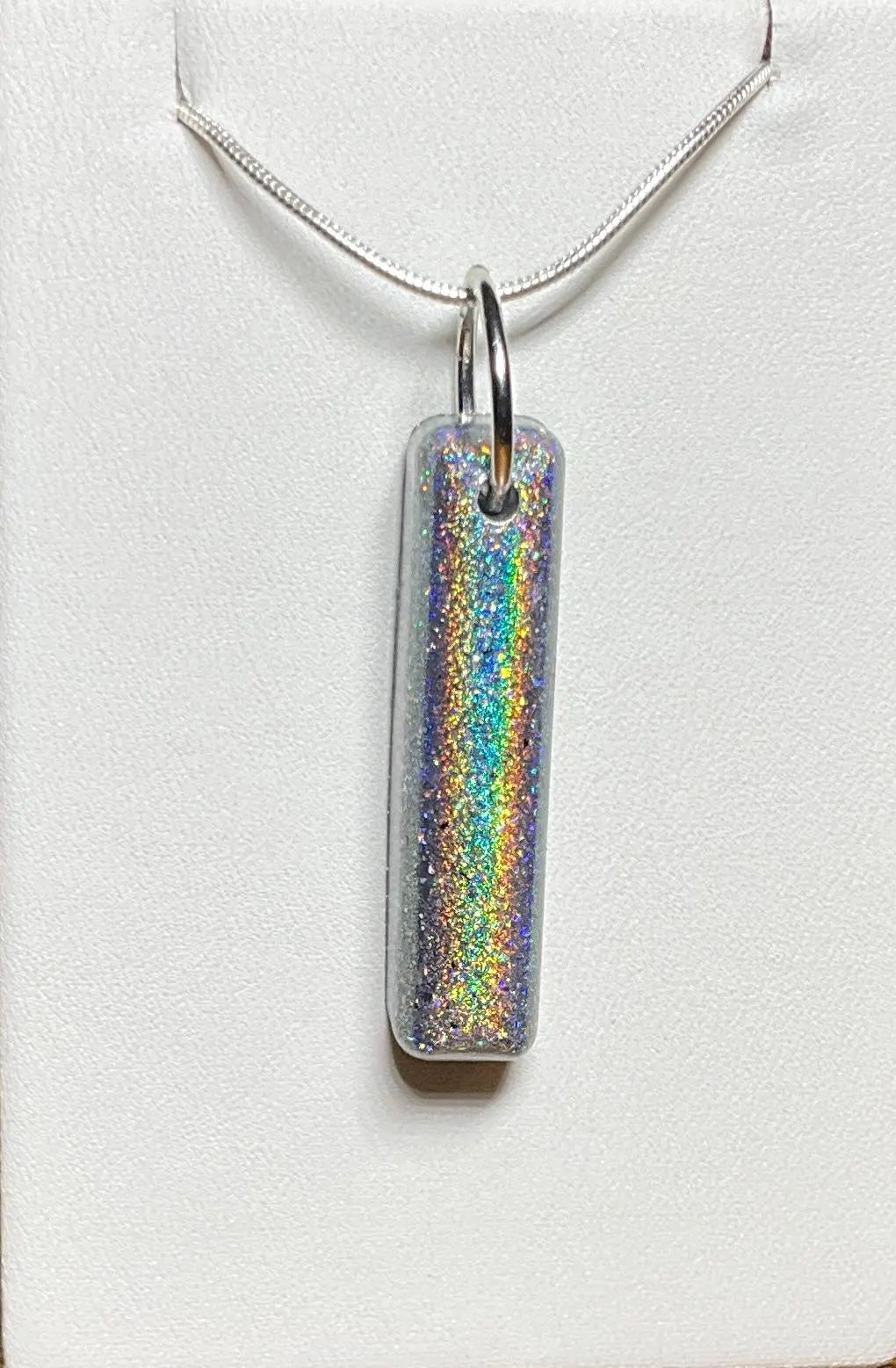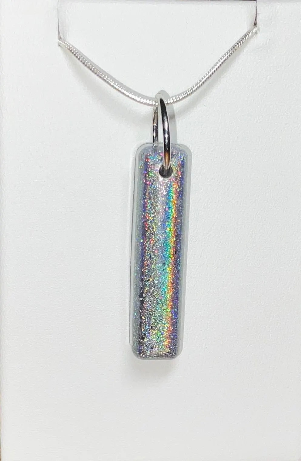 Add a little magic to your jewelry collection with this captivating sparkly holographic necklace. The pendant features a mesmerizing holographic effect that shifts and shimmers with every movement, reflecting an array of colors that catch the eye and light up any outfit. Its sleek, modern design makes it a standout piece that effortlessly blends elegance with fun.