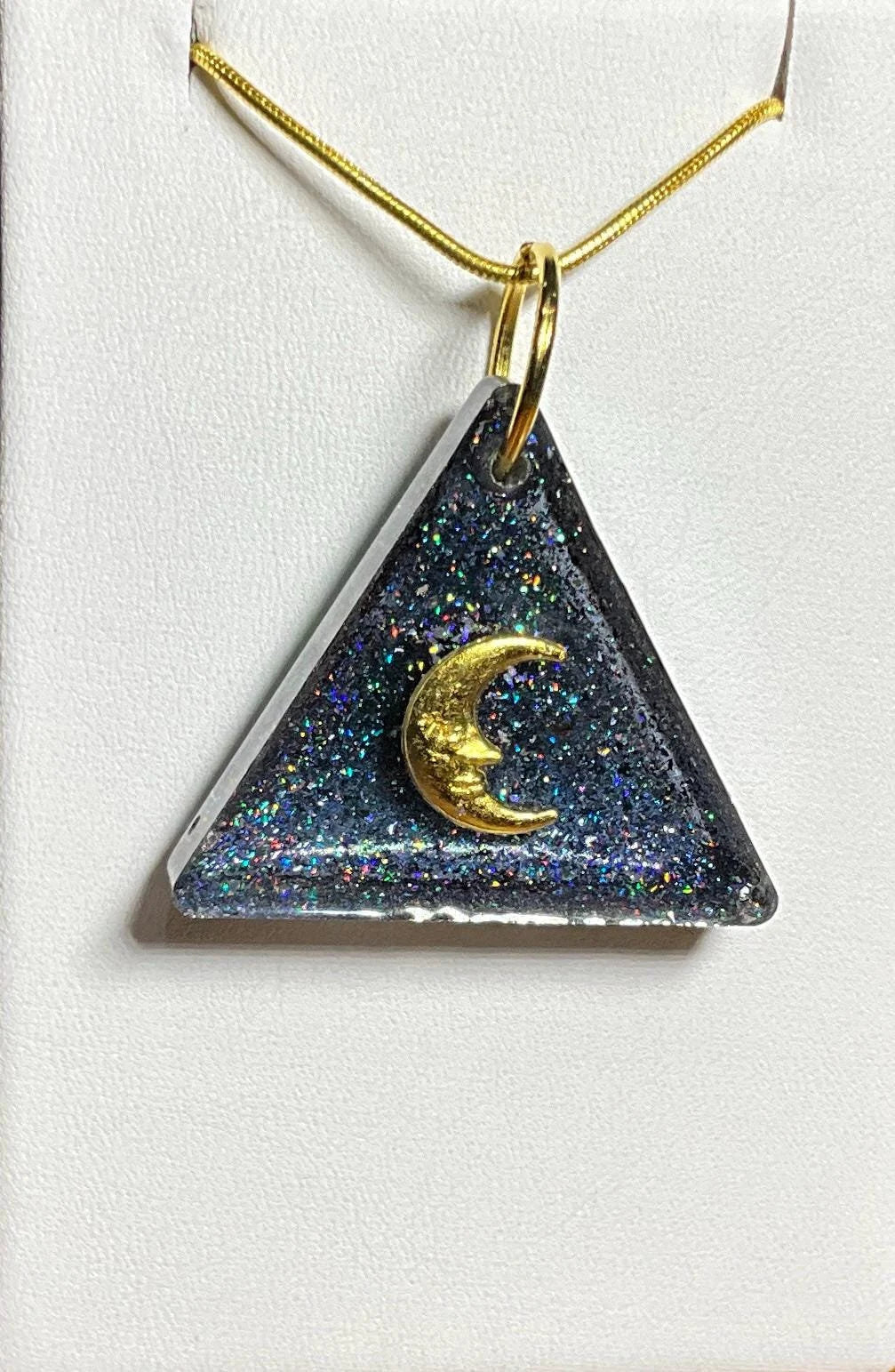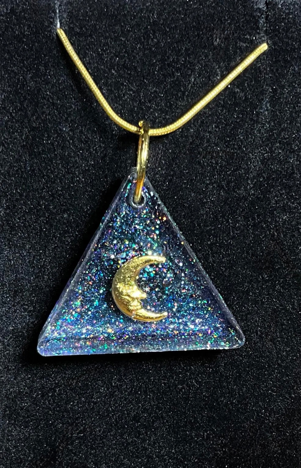 Embrace the beauty of the night with this stunning and versatile necklace. On one side, you'll find a graceful moon set against a background reminiscent of the night sky, capturing the essence of tranquility and mystery. Flip it over to reveal a dazzling holographic pattern that shifts and sparkles with every movement, adding a touch of modern flair.
