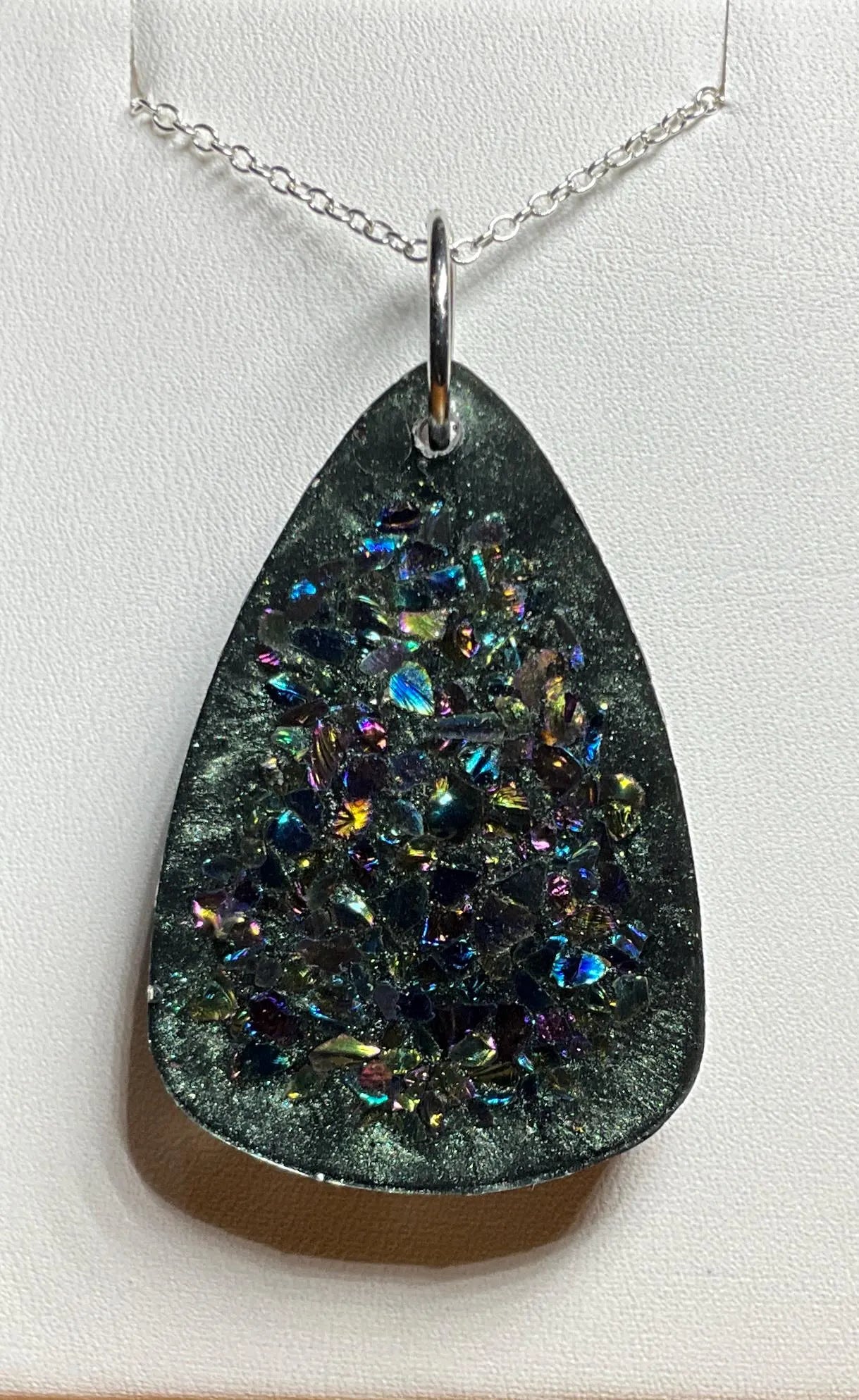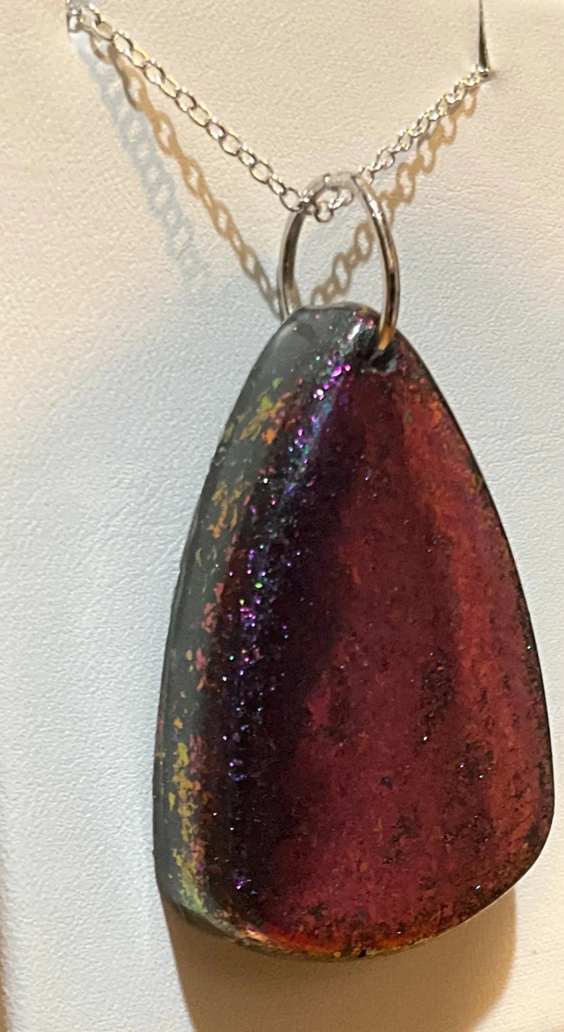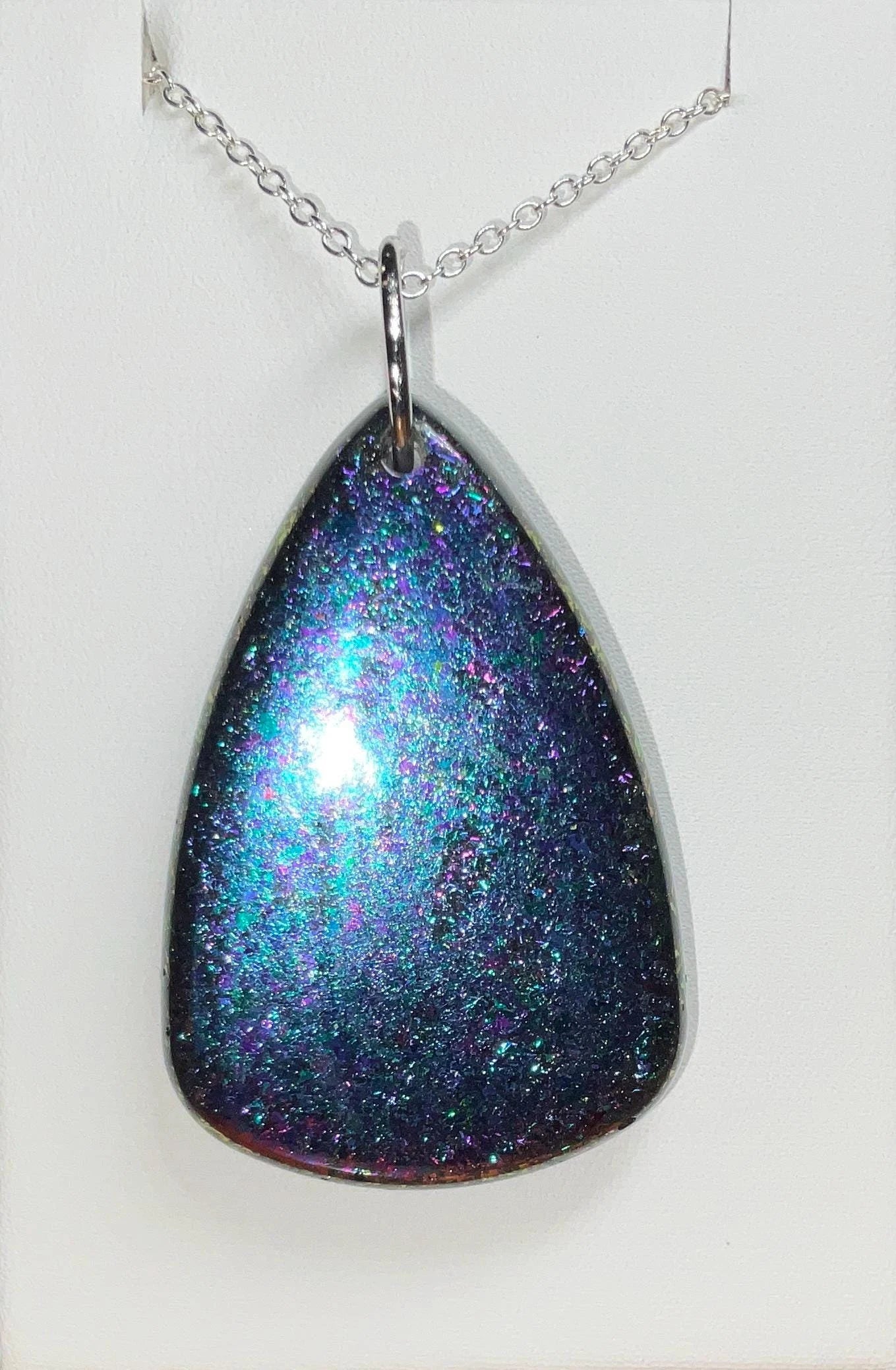 - Side Two: Flip the pendant to reveal a captivating surface coated in Color-Shift pigment, transitioning smoothly between rich shades of blue, purple, and red. This mesmerizing finish shifts with light and angle, offering a subtle yet powerful glow of dynamic beauty.