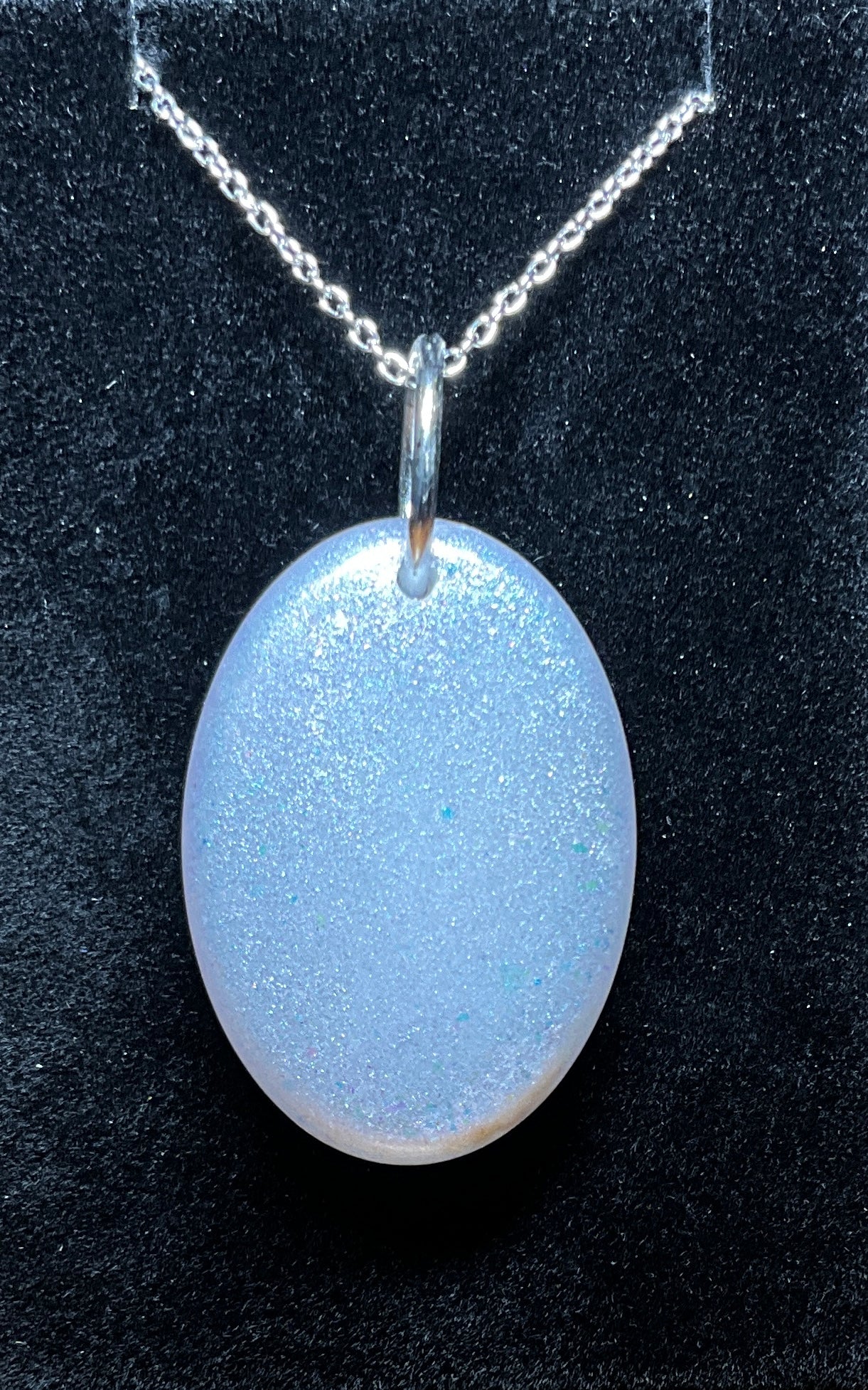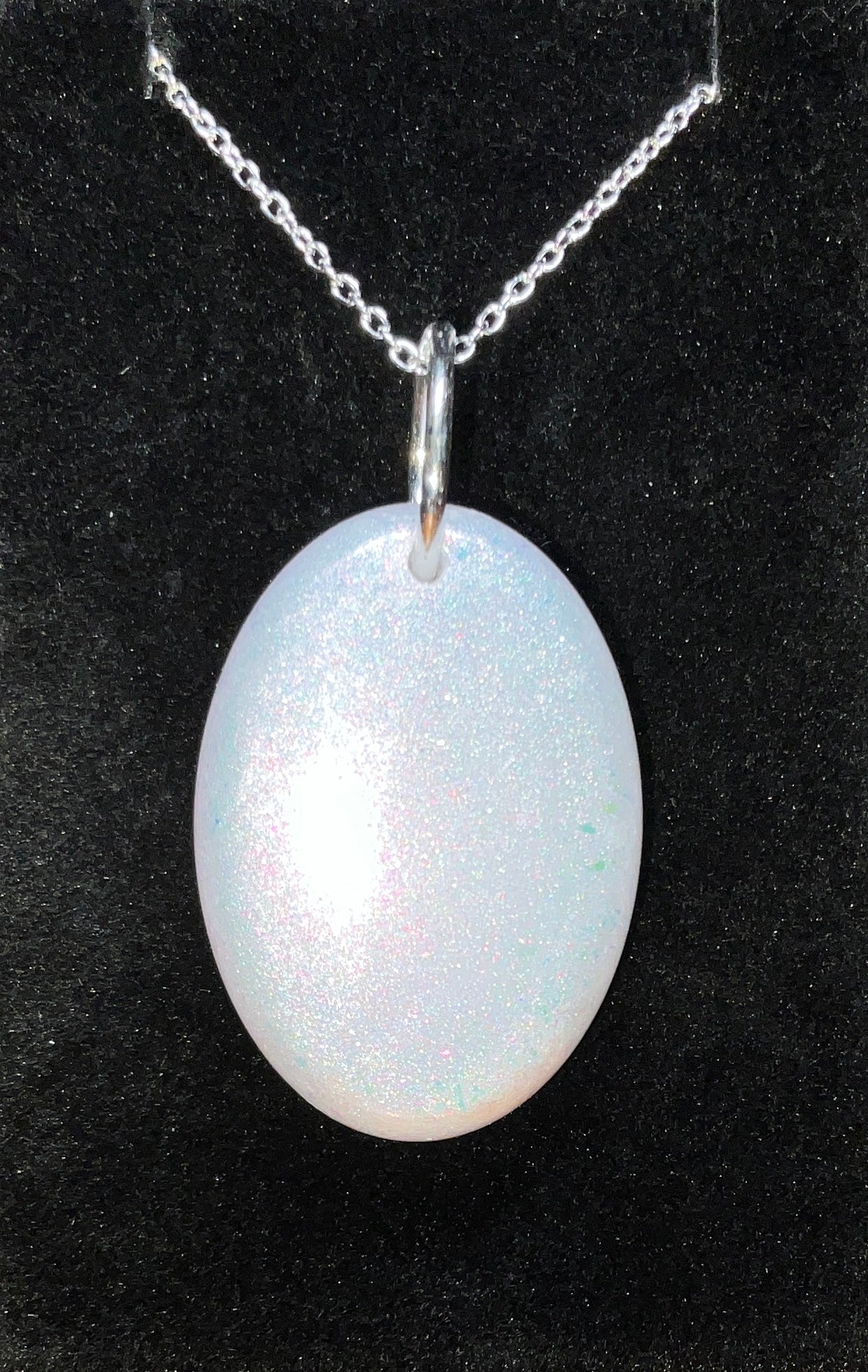 Side 2: Flip the pendant to reveal a captivating blend of light shimmery colors that shift and change depending on the light and angle, adding a touch of magic to your accessory collection.