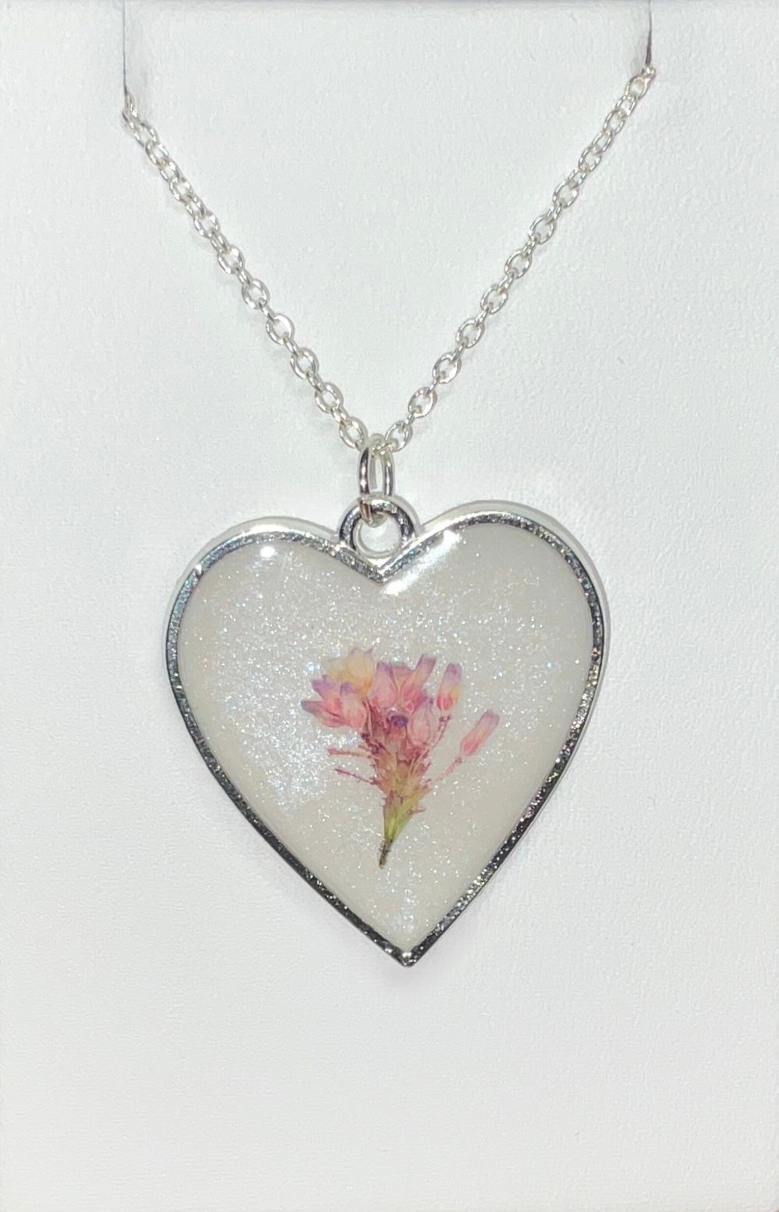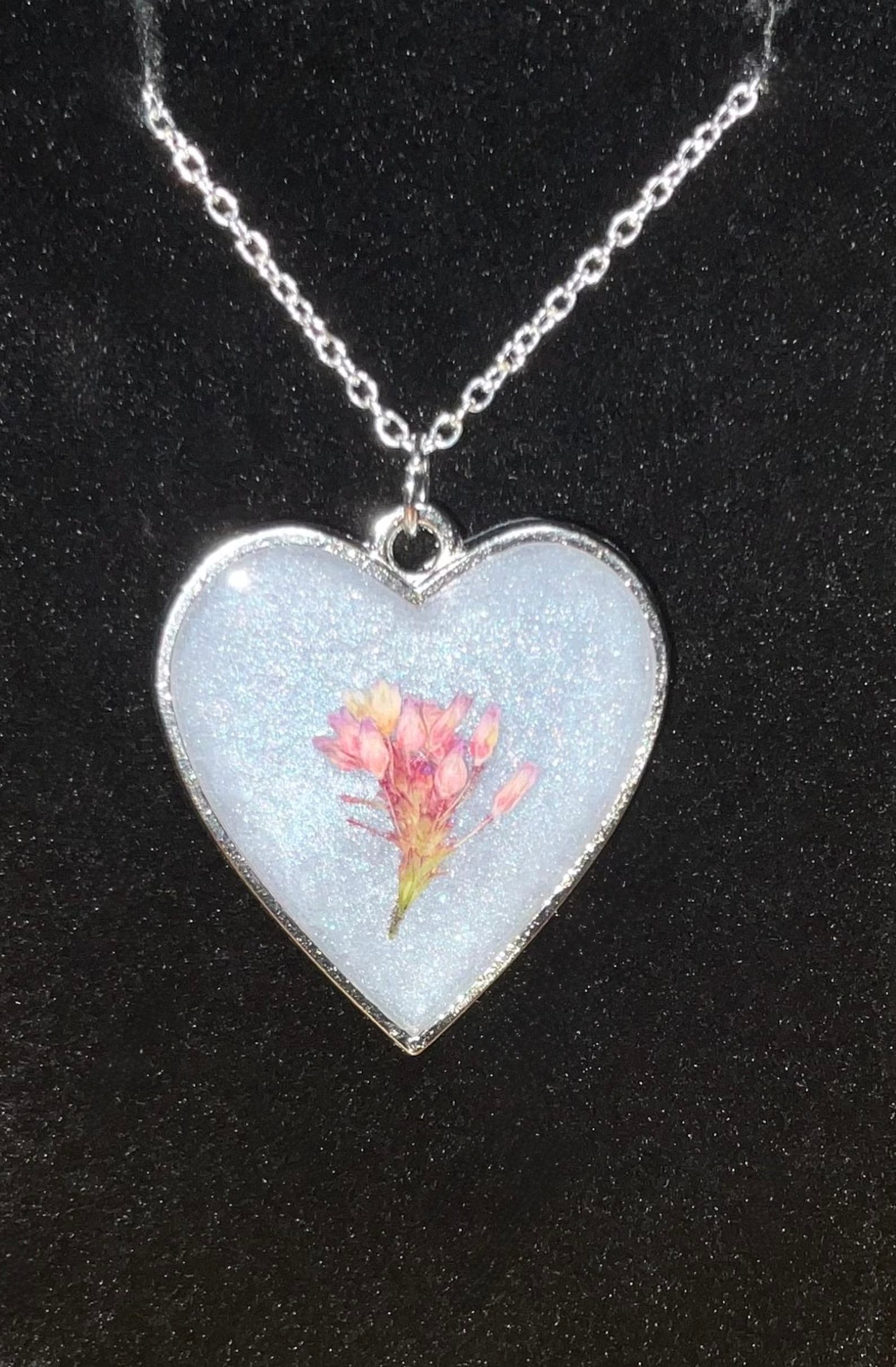 Add a touch of romance to your look with this delicate heart-shaped pendant necklace, featuring pink flowers beautifully encased in clear resin. This charming piece captures the elegance of nature, making it a perfect accessory for adding a soft, romantic flair to any outfit.