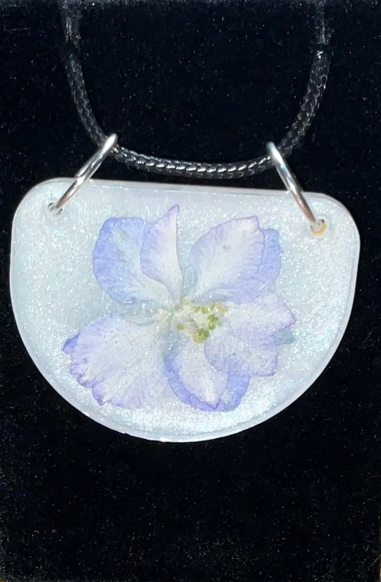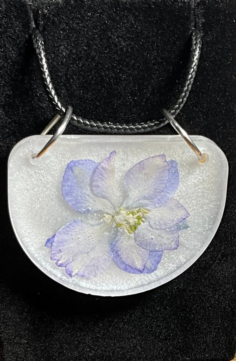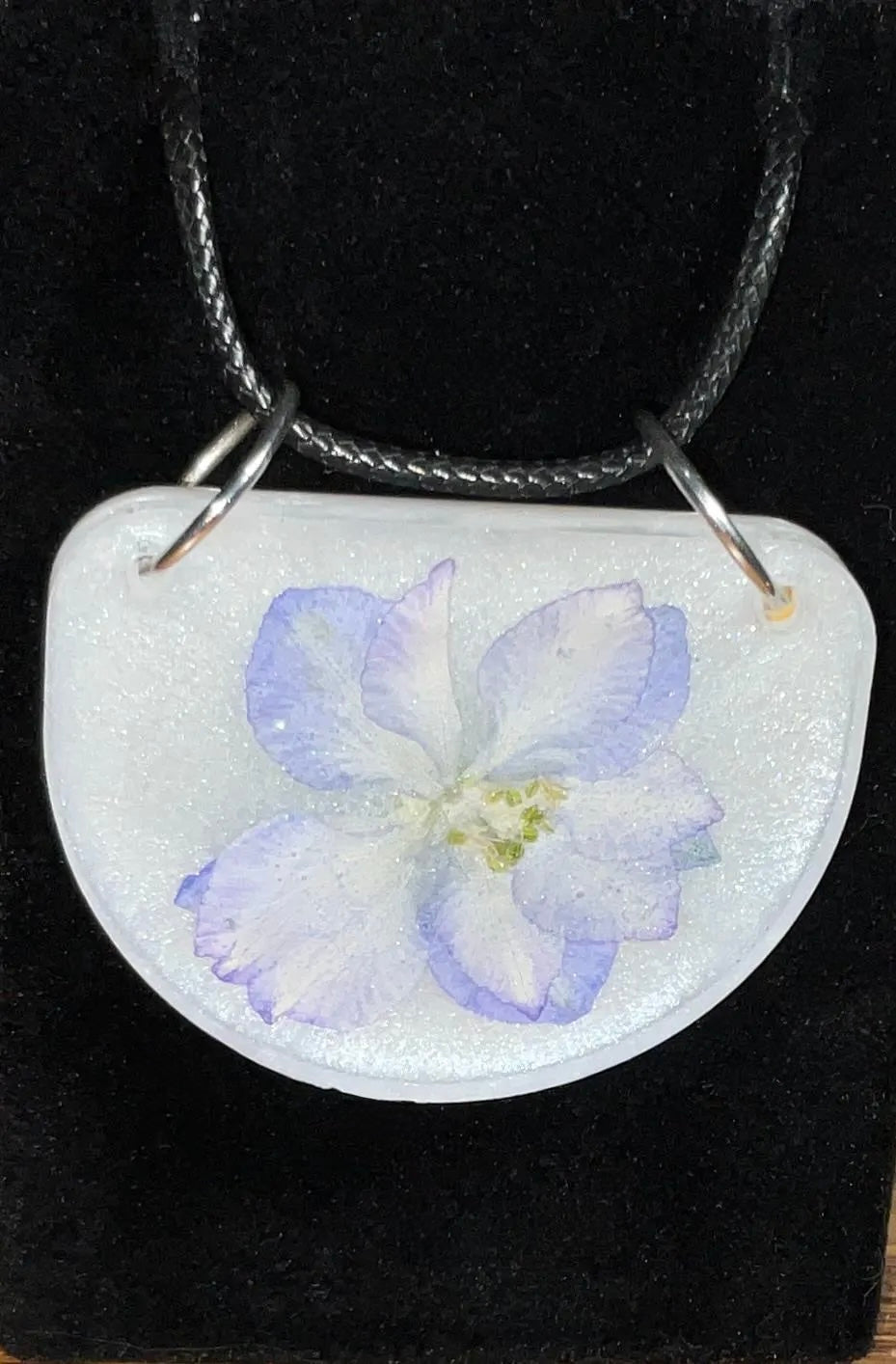 Carry a piece of nature with you wherever you go with this enchanting pressed flower resin pendant necklace. Featuring a delicate light purple larkspur, this pendant showcases the grace and elegance of natural blooms. A shimmering white backing enhances the flower’s beauty, offering a subtle glow that adds charm and versatility to your look.
