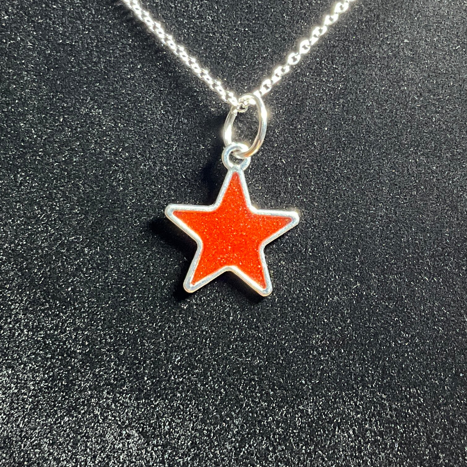 Shine bright with this handcrafted shimmery red star necklace, a dazzling piece that captures the beauty and wonder of the night sky. The pendant simmers with vibrant red hues that shimmer as they catch the light, creating a striking yet elegant accessory. Perfect for adding a touch of celestial charm to your everyday look or special occasions.