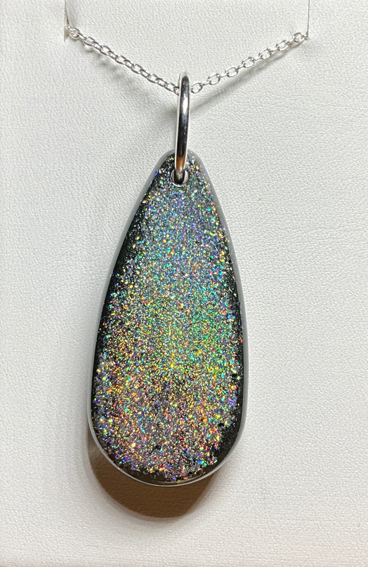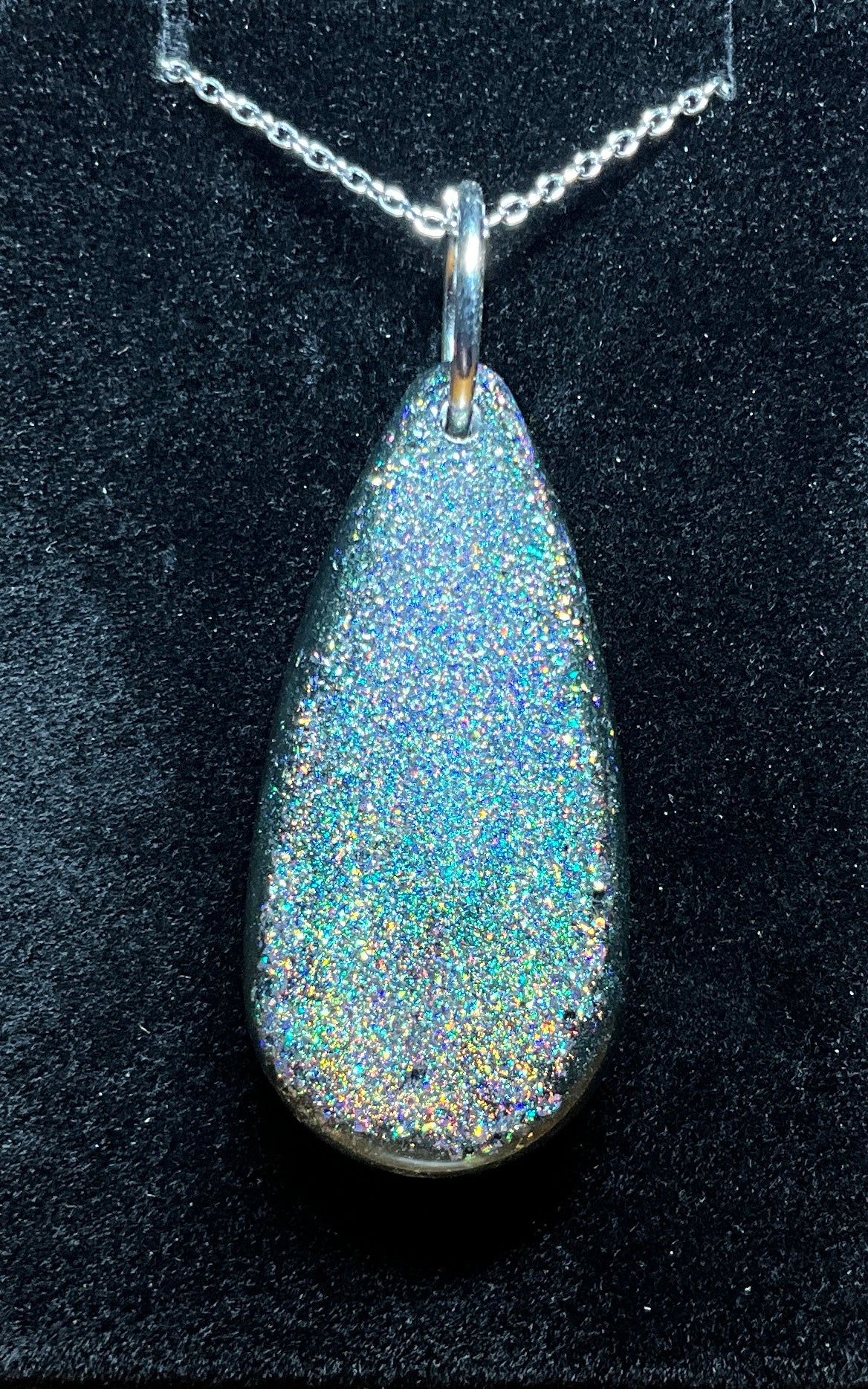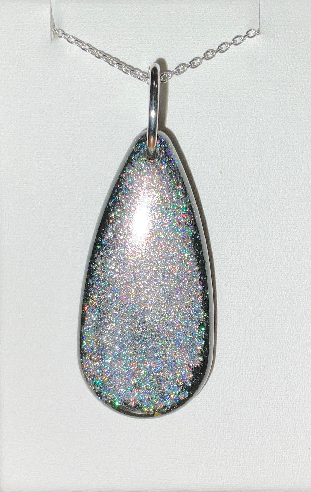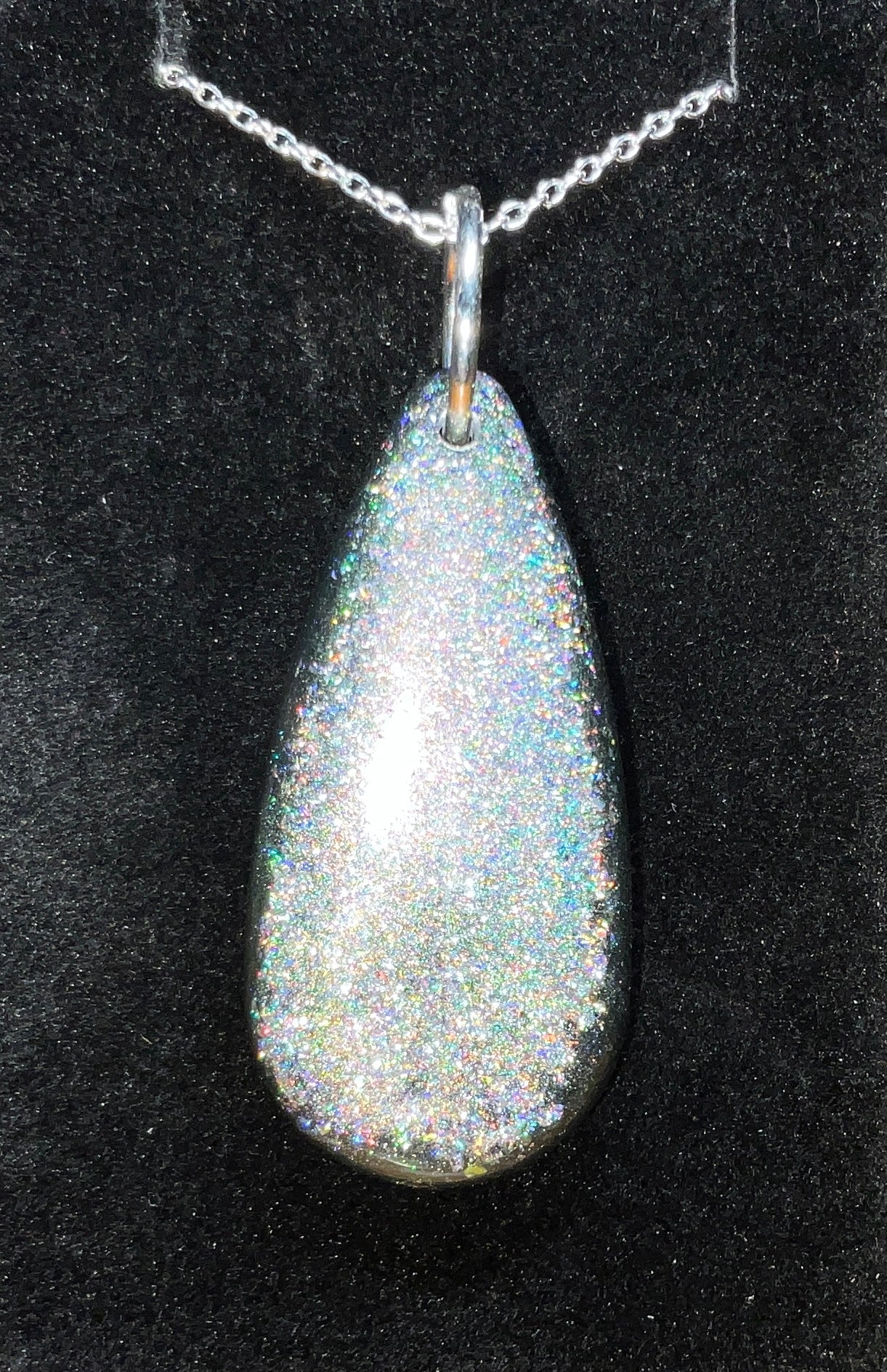 Side 2: Flip the pendant to reveal a dazzling silver holographic side that catches the light beautifully, offering a dynamic and versatile look.
