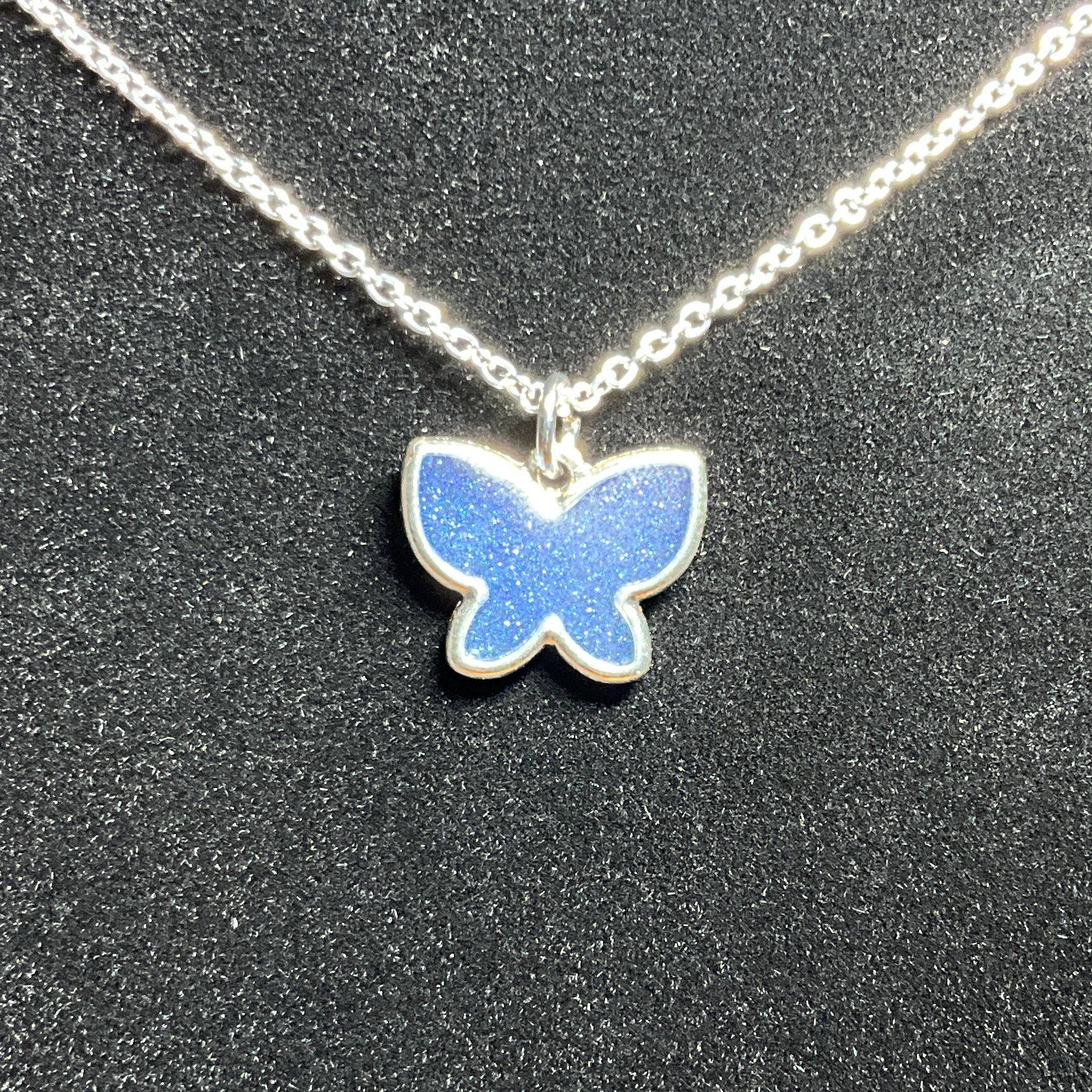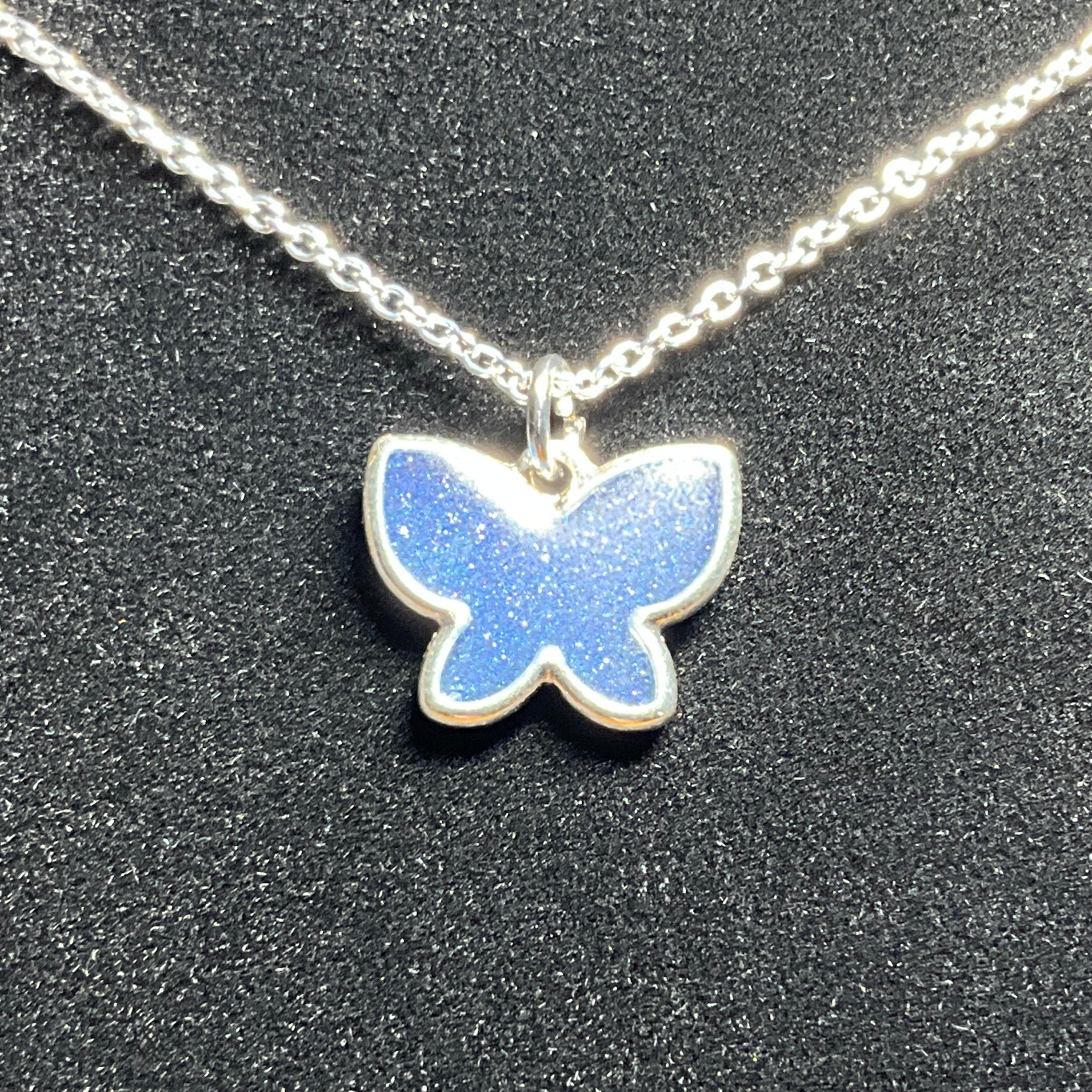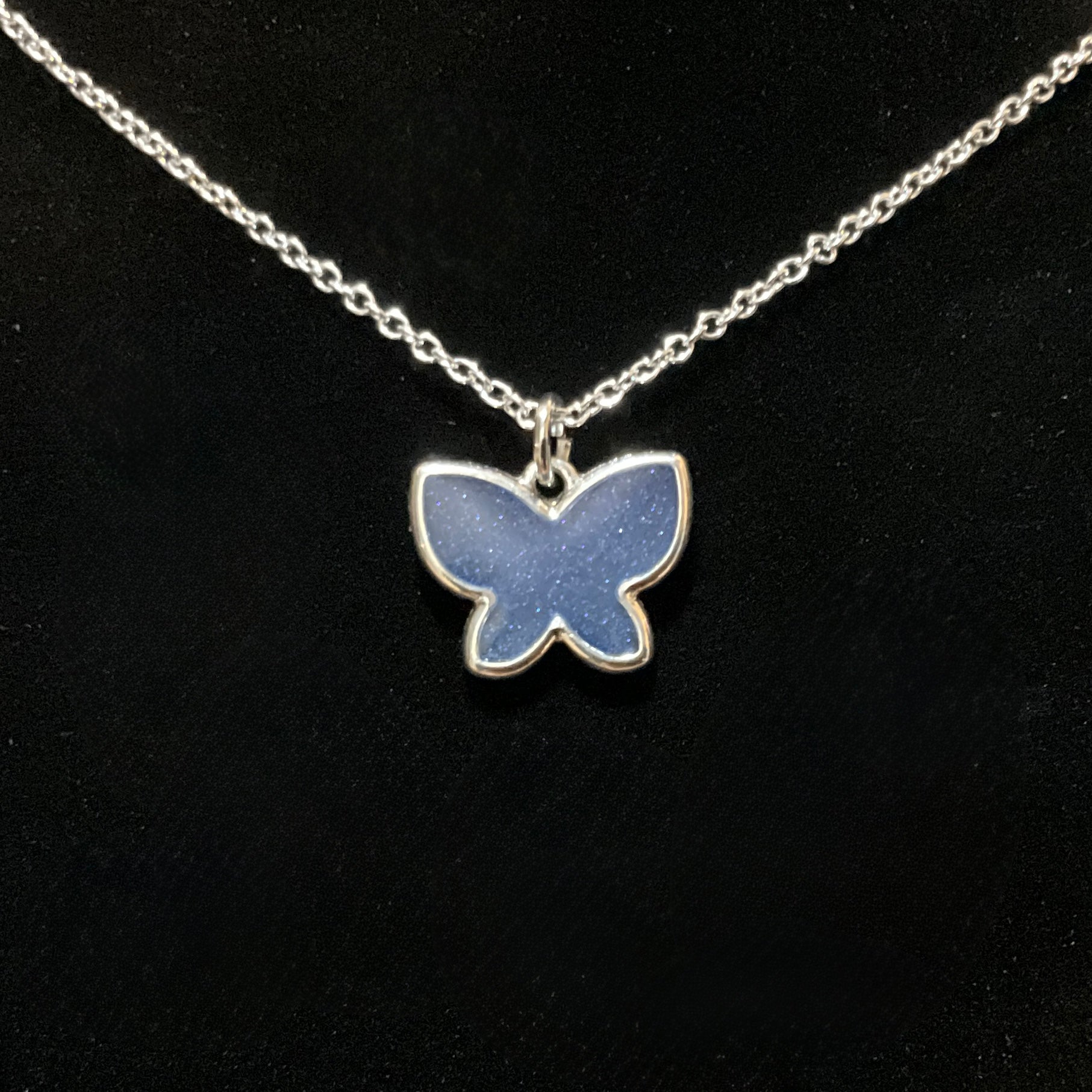 Add a subtle yet enchanting sparkle to your look with this handcrafted shimmery blue butterfly necklace. This petite pendant gleams in the light, showcasing a soft, iridescent blue that shifts with movement, creating a graceful and elegant effect. Despite its small size, the delicate details of the butterfly capture the beauty and serenity of nature, making it the perfect accent for any outfit.