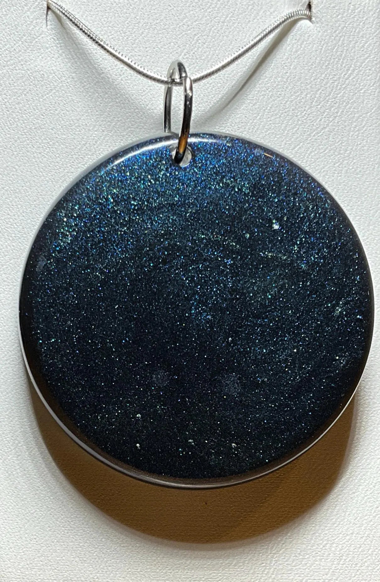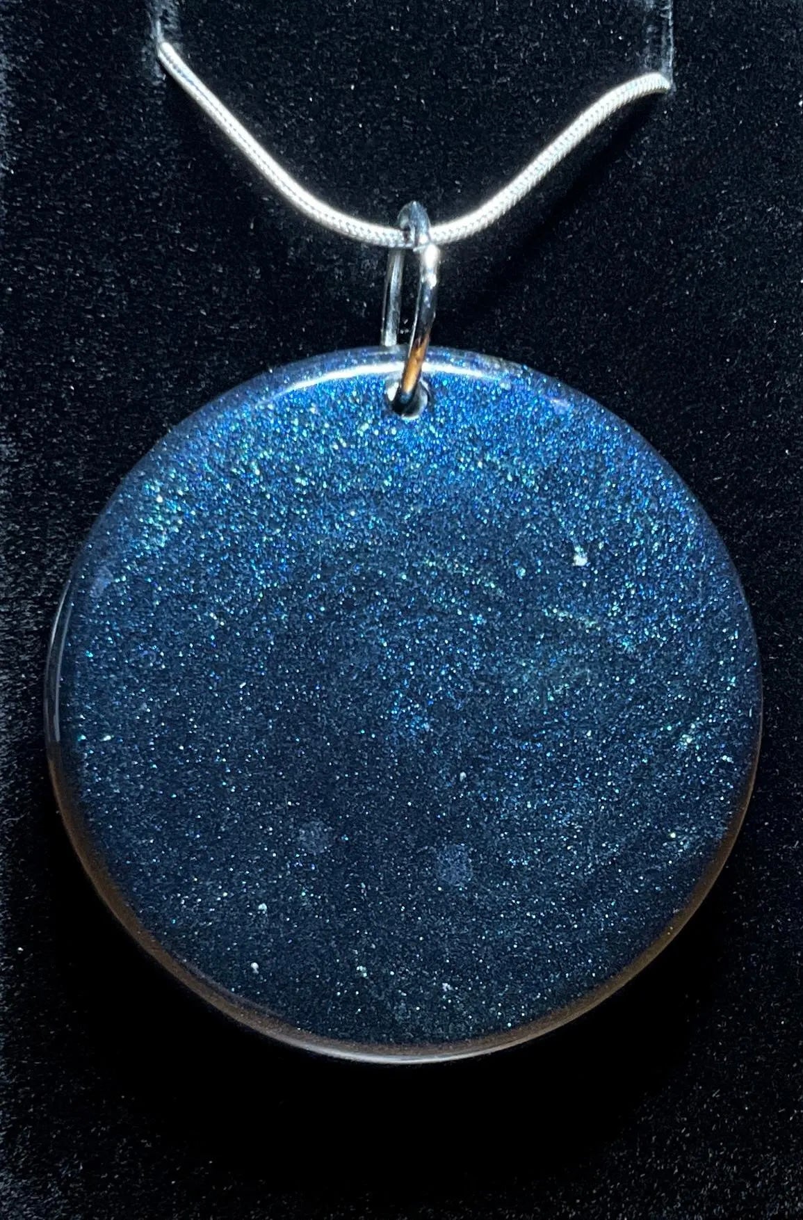 Take a journey through the stars with this captivating handmade Space Travel Necklace – the perfect accessory for those who dream of distant galaxies and celestial adventures. One side of the pendant showcases a mesmerizing space scene set against a shimmering dark blue background, evoking the mystery and beauty of the cosmos. Flip it over to reveal a matching deep blue, color-shift design that subtly changes with the light, offering two stunning looks in one.