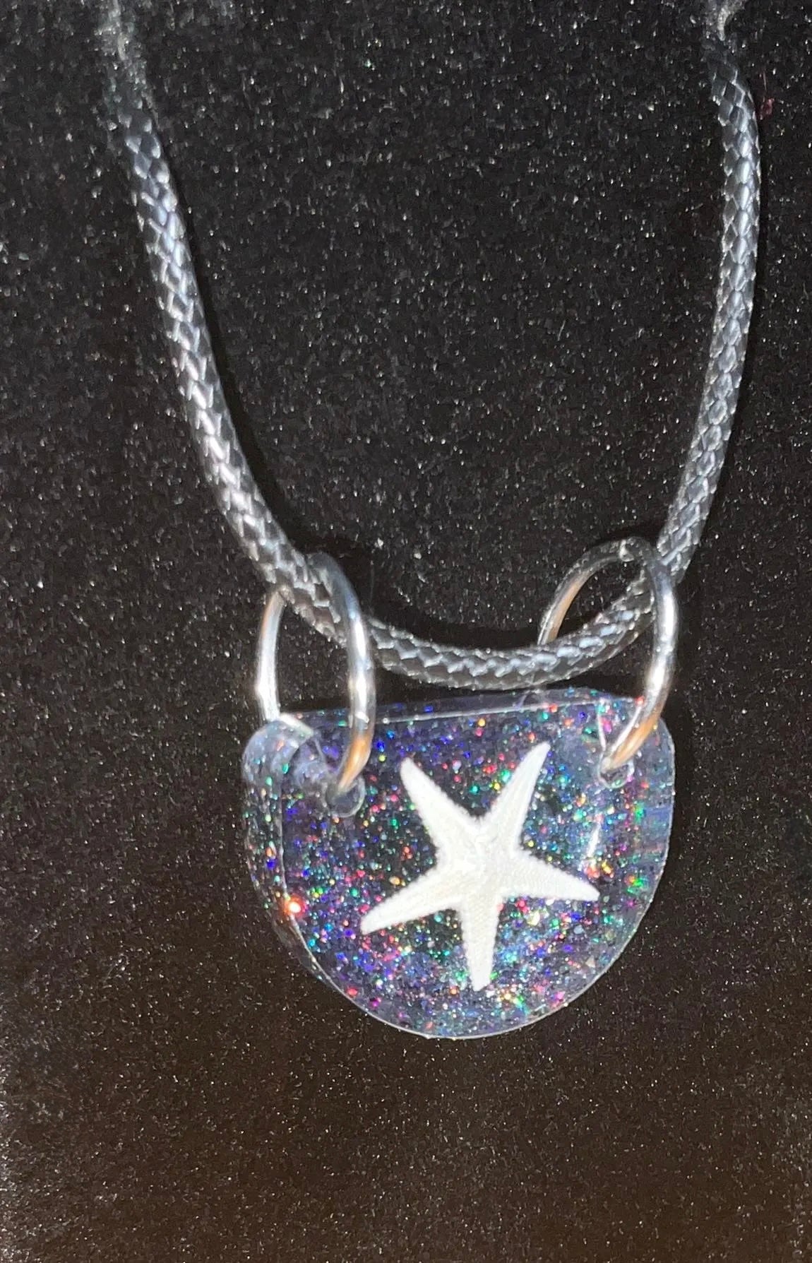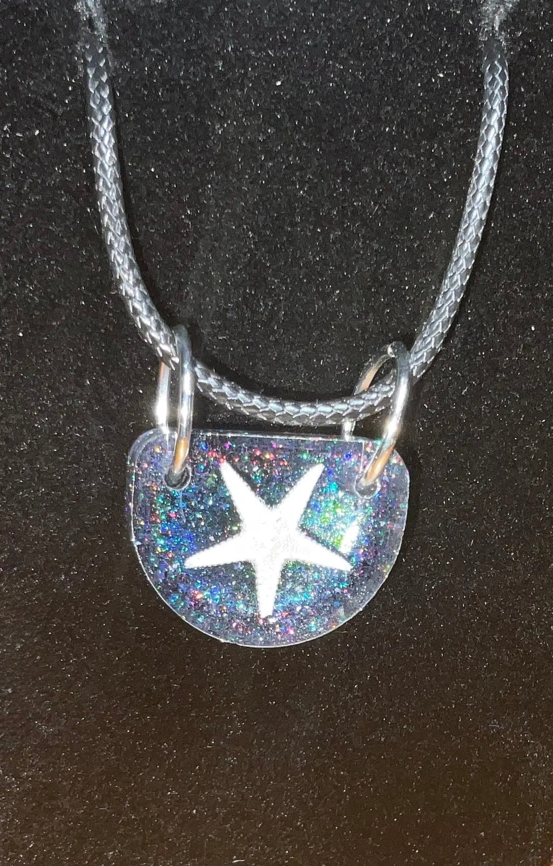Capture the enchanting beauty of the sea with this stunning, handcrafted Starfish Holographic Necklace. Featuring a unique two-sided pendant, this necklace brings the magic of the ocean to life. On one side, a real starfish is set against a shimmering dark blue backdrop, evoking the serene depths of the ocean. Flip the pendant over to reveal a mesmerizing design enhanced with color-shift pigments, showcasing stunning shades of purple, green, and blue that change and shift with the light and angle – creating an ever-evolving, magical effect.