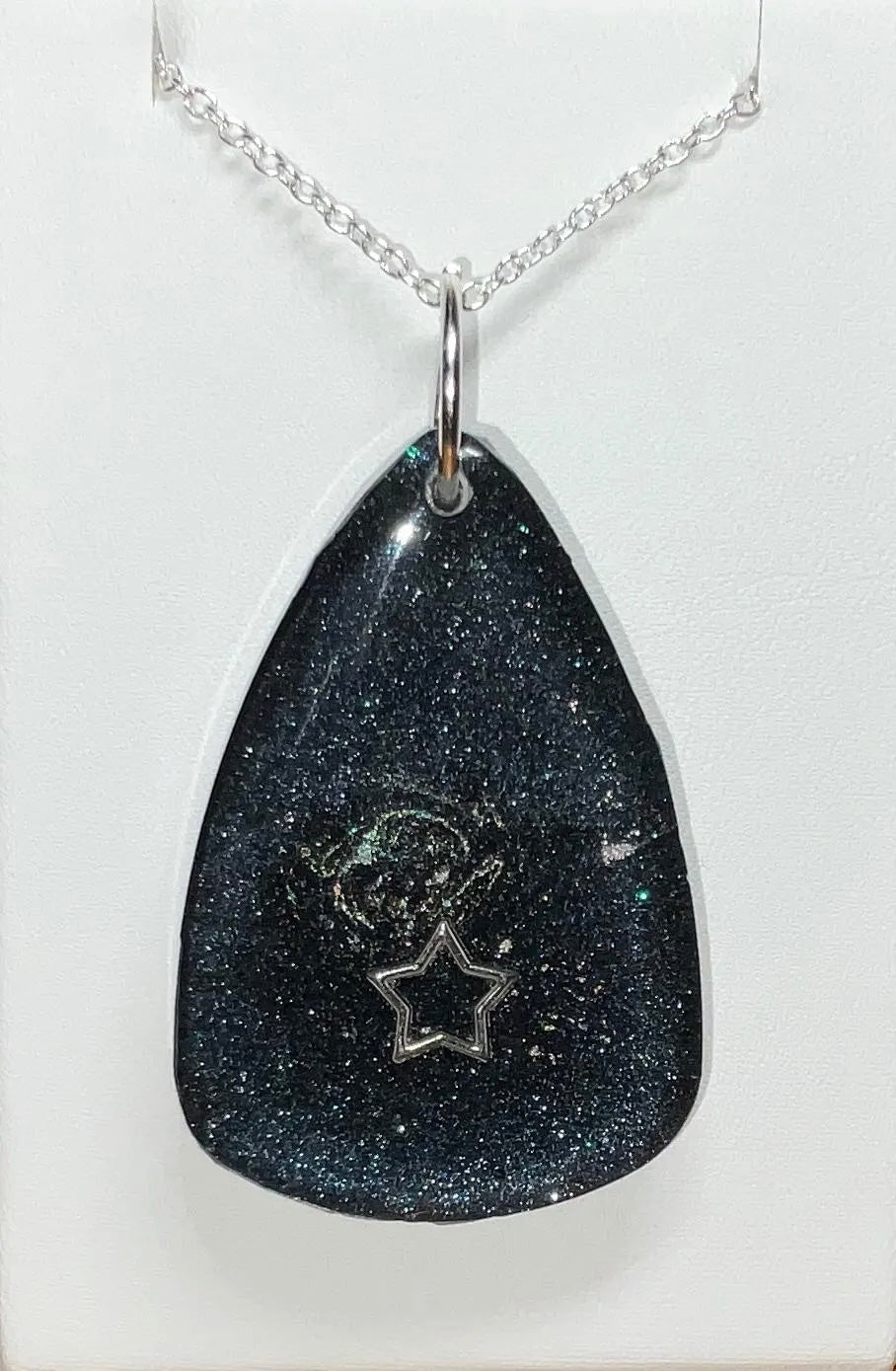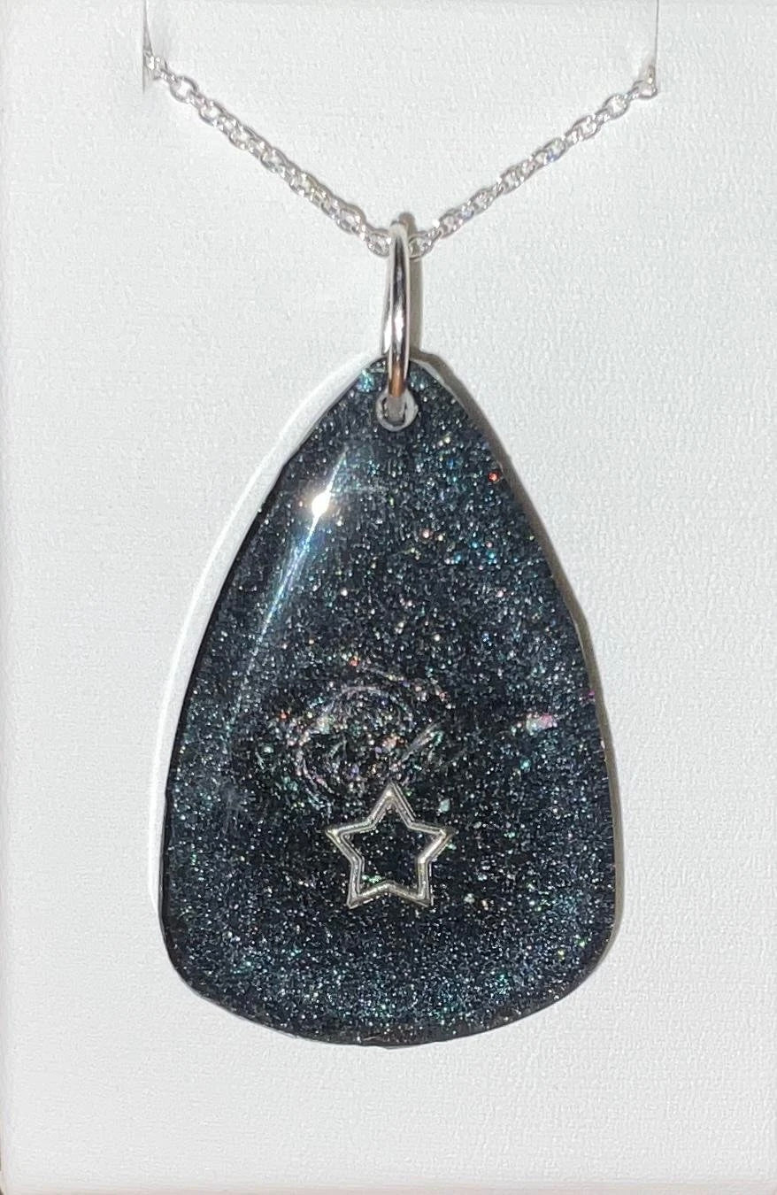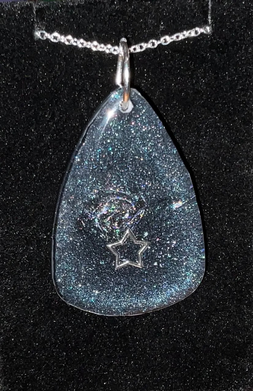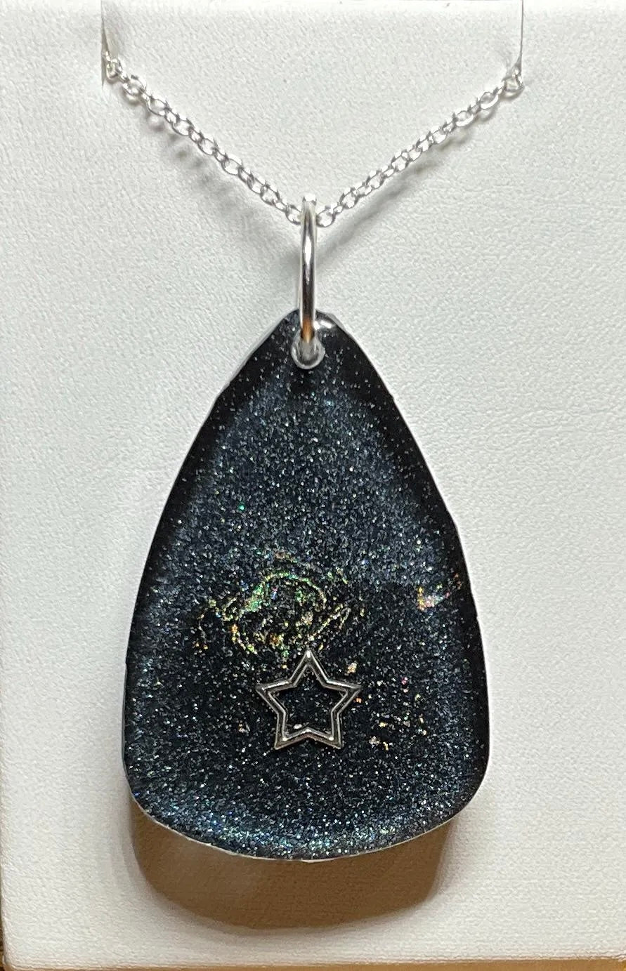 Infuse your style with the enchanting beauty of the cosmos with this handmade Starry Cosmos Necklace. One side of the pendant features a radiant star set against a shimmering background, capturing the awe and mystery of the night sky. Flip it over to reveal a matching, luminous design – a versatile look that transitions seamlessly from day to night. Crafted with Color-Shift pigments, the pendant subtly changes in appearance depending on the angle and light, offering a dynamic and captivating effect.