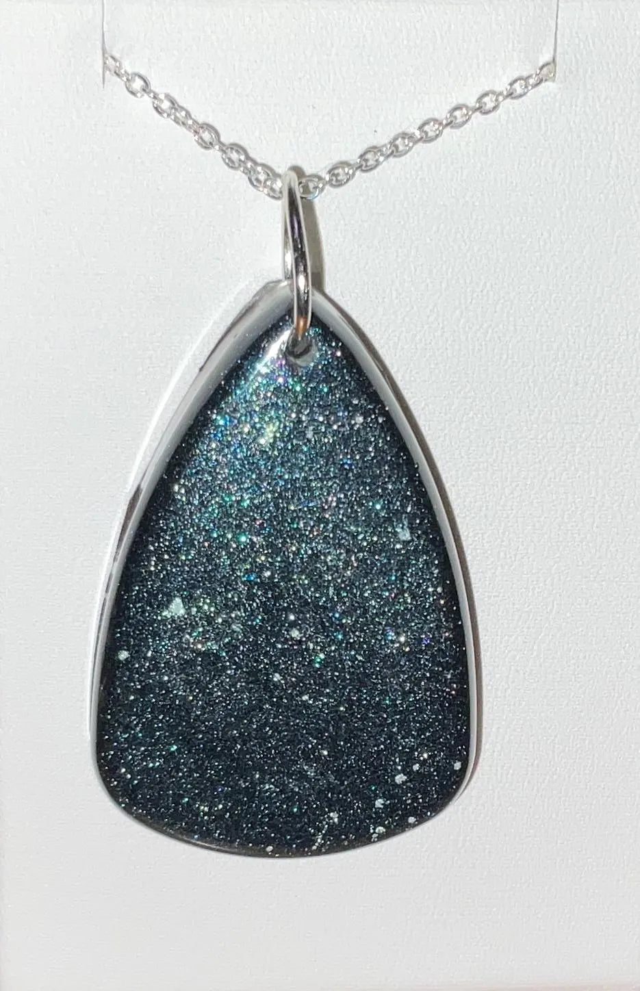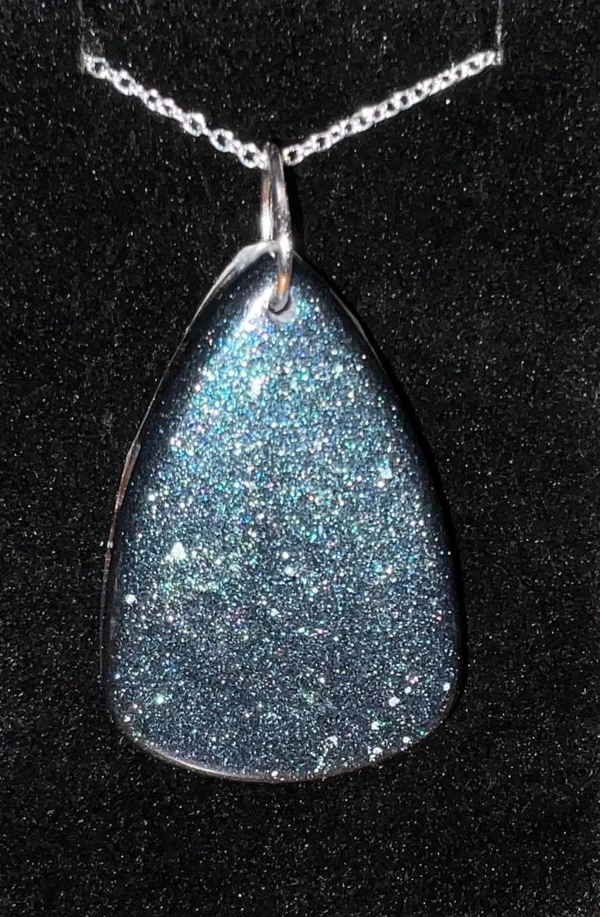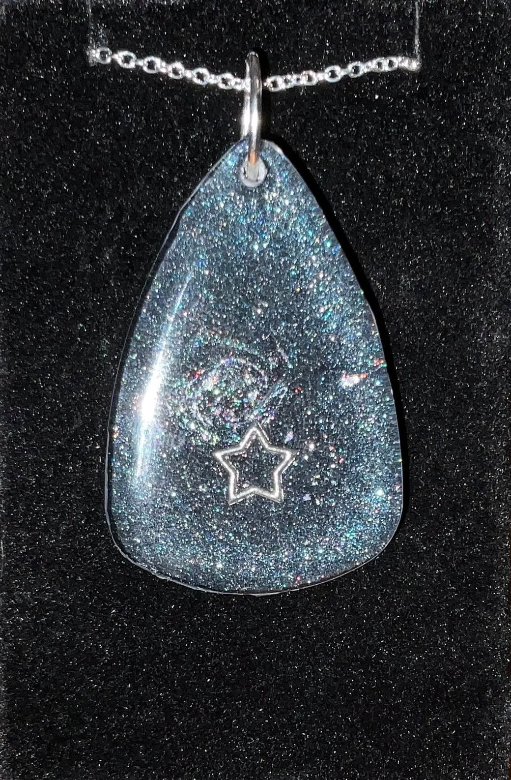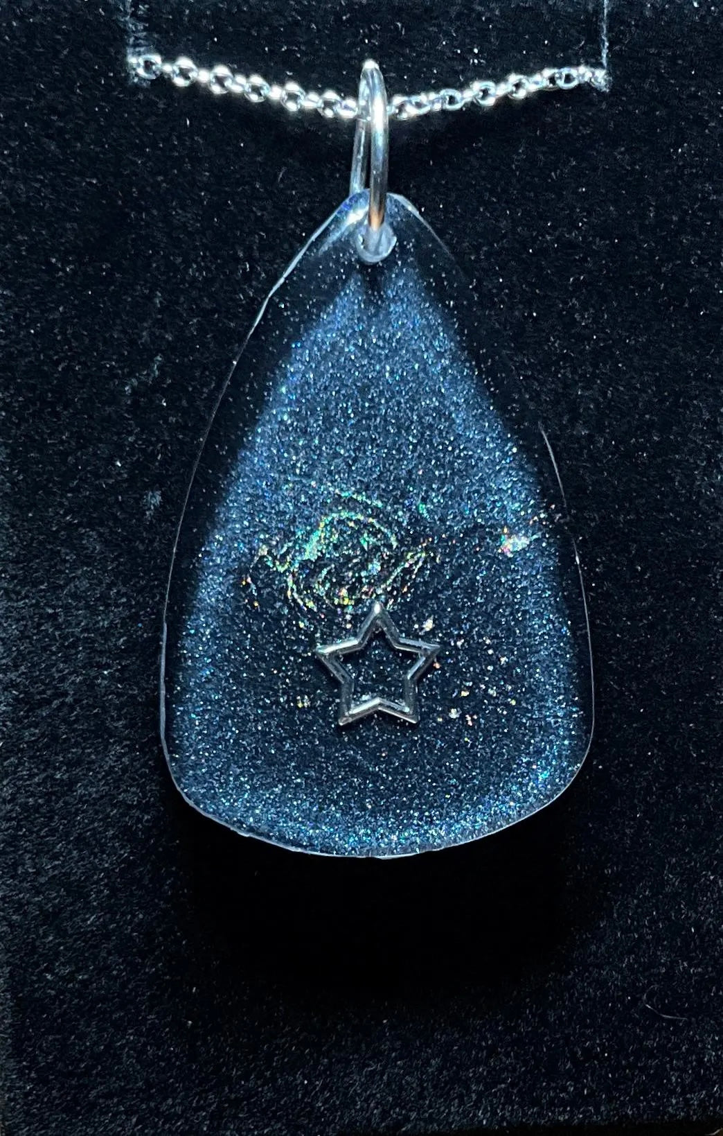 Infuse your style with the enchanting beauty of the cosmos with this handmade Starry Cosmos Necklace. One side of the pendant features a radiant star set against a shimmering background, capturing the awe and mystery of the night sky. Flip it over to reveal a matching, luminous design – a versatile look that transitions seamlessly from day to night. Crafted with Color-Shift pigments, the pendant subtly changes in appearance depending on the angle and light, offering a dynamic and captivating effect.