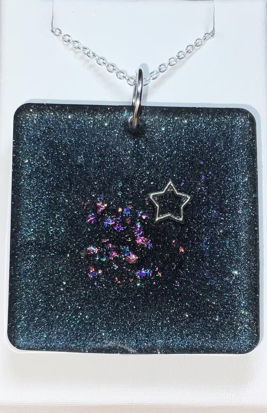 Add a touch of celestial magic to your look with this stunning handmade Starry Cosmos Necklace. One side features a radiant star set against a shimmering background, capturing the awe and mystery of the cosmos. Flip it over to reveal a matching, mesmerizing design, offering a versatile, two-in-one look that transitions seamlessly from day to night. Crafted with Color-Shift pigments, the pendant changes with the light, adding an ever-evolving dynamic to your accessory collection.