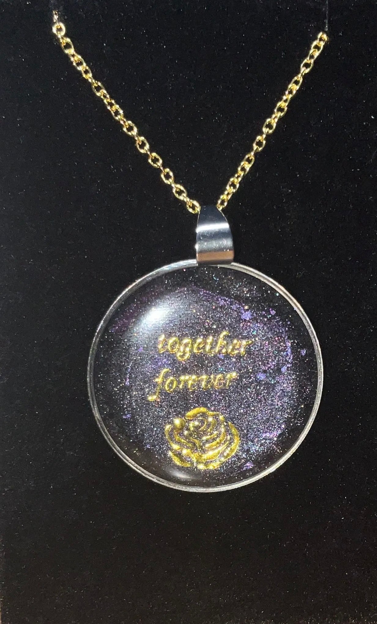 Celebrate your bond with this enchanting Together Forever Necklace. Featuring a delicate gold flower paired with the heartfelt words “Together Forever,” set against a shimmering purple background, this pendant captures the essence of love, affection, and lasting connection. The thoughtful design makes it a meaningful keepsake, perfect for expressing the warmth and beauty of your relationship.