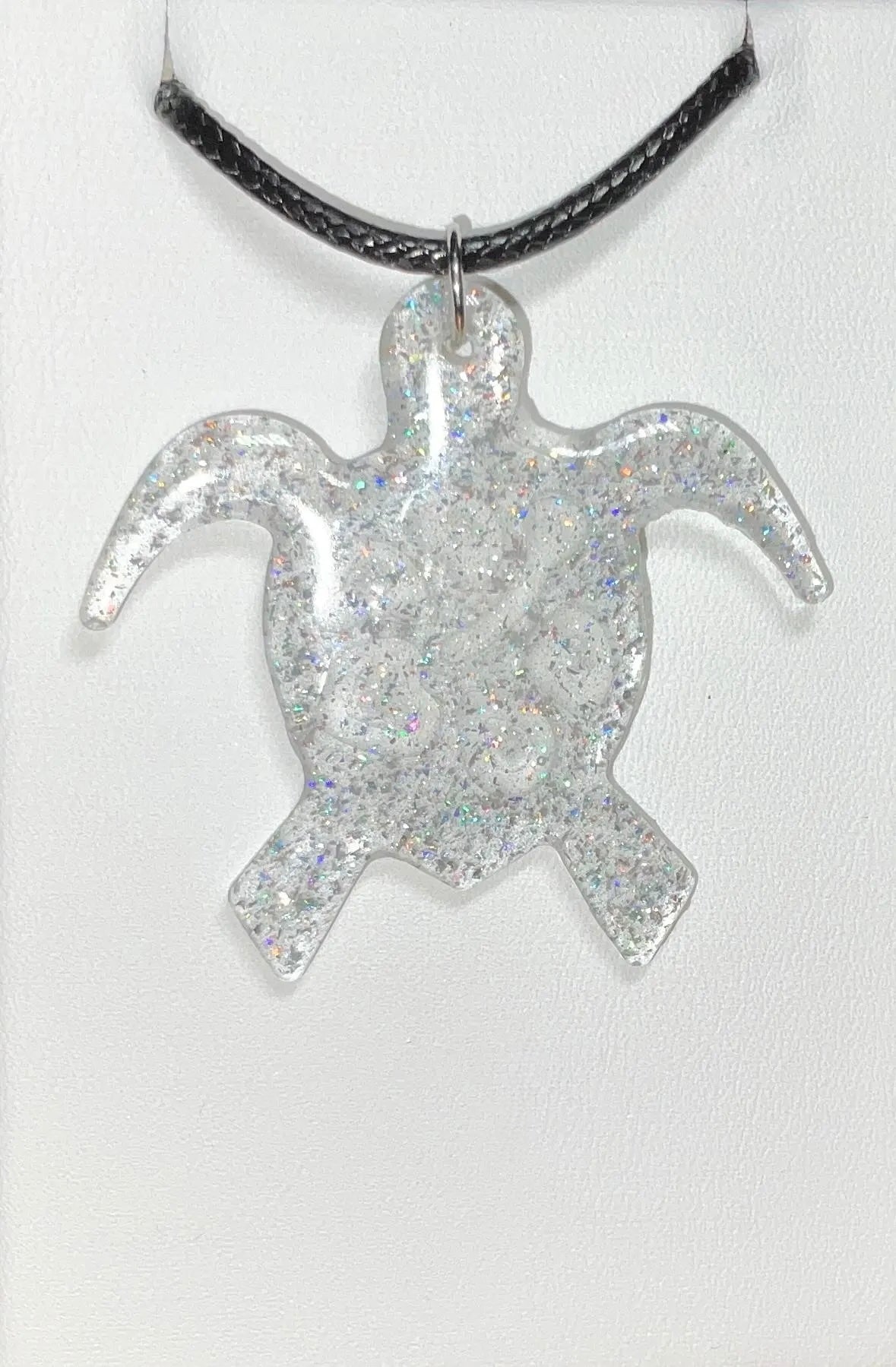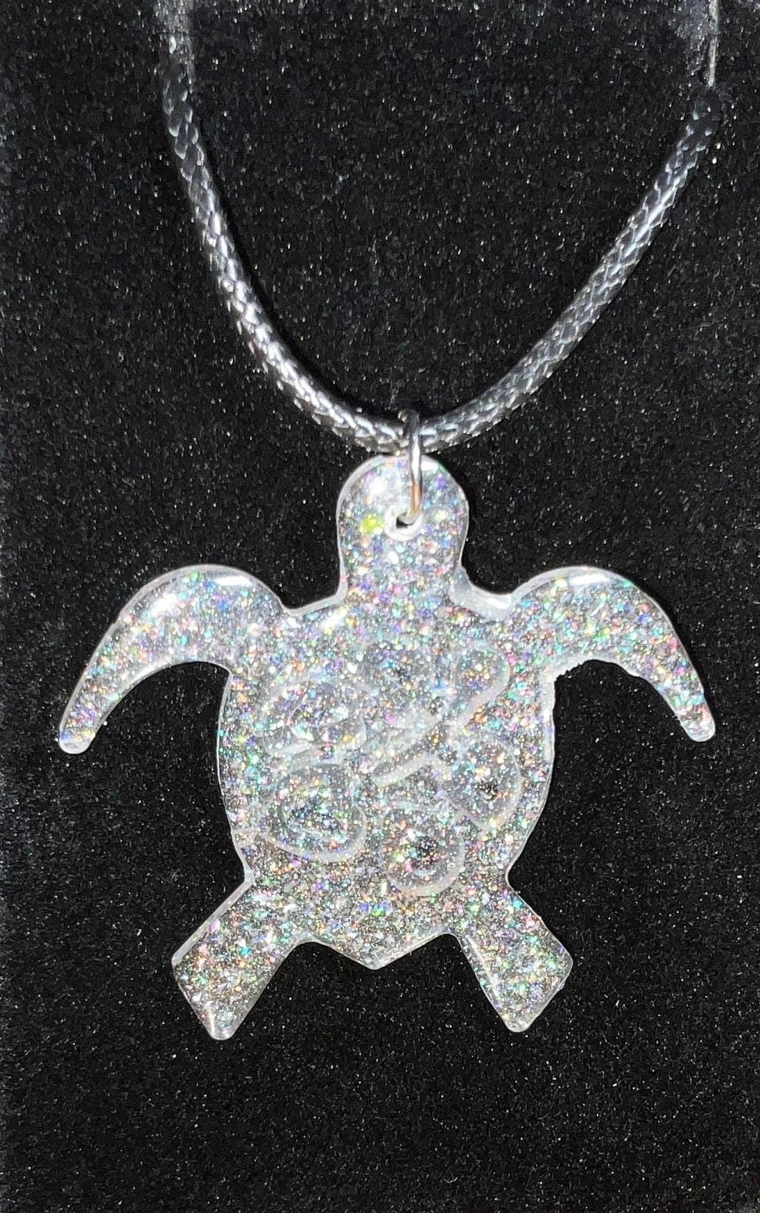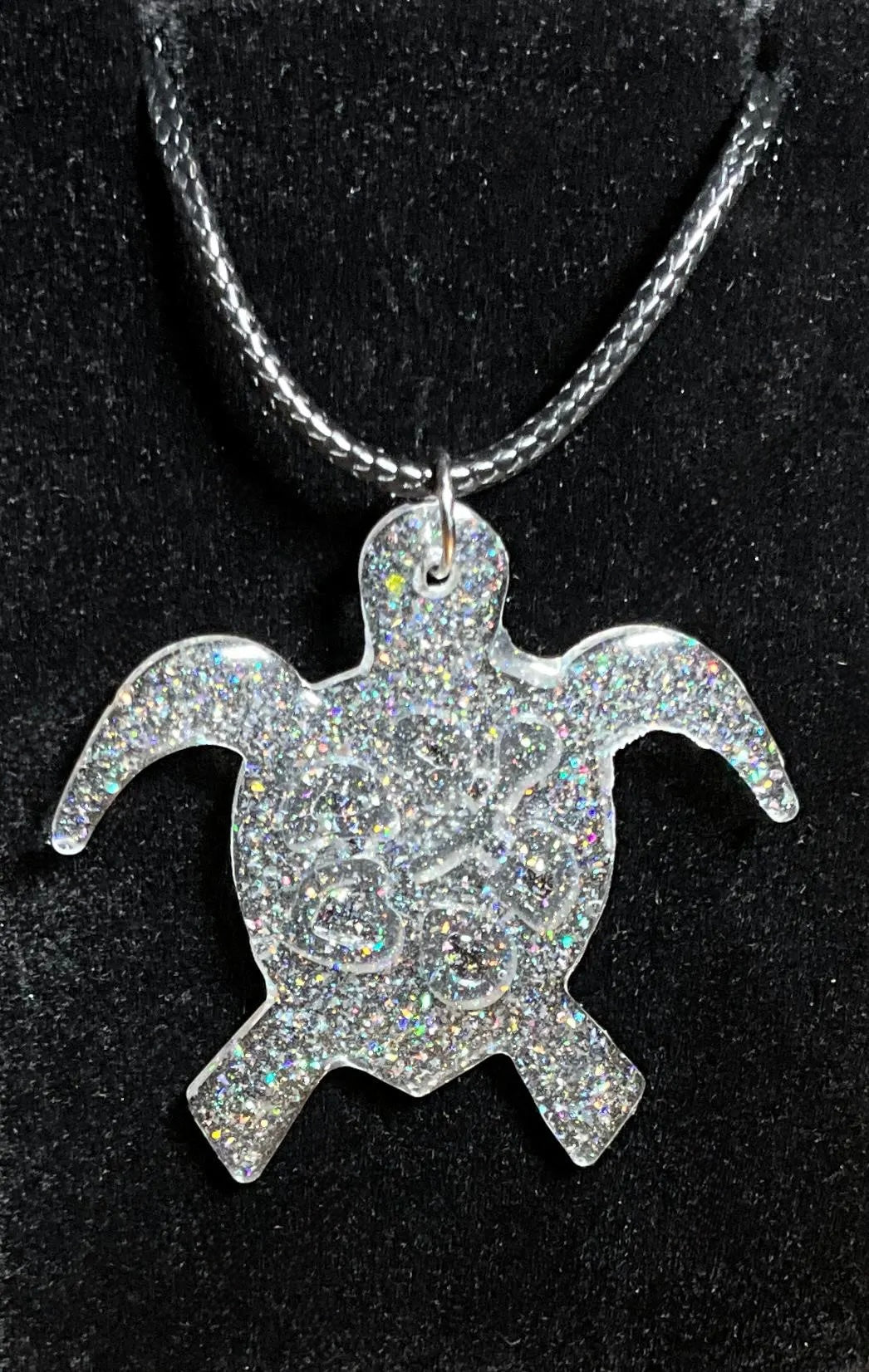 Add a touch of nature-inspired magic to your look with this stunning turtle pendant necklace, crafted with holographic glitter encased in clear resin. Turtles are revered across cultures for their symbolism of wisdom, protection, and longevity. Known for their deep connection to both land and sea, turtles embody resilience and perseverance. Their slow, deliberate movement reminds us to embrace life's journey at our own pace, remaining mindful and grounded as we move forward.