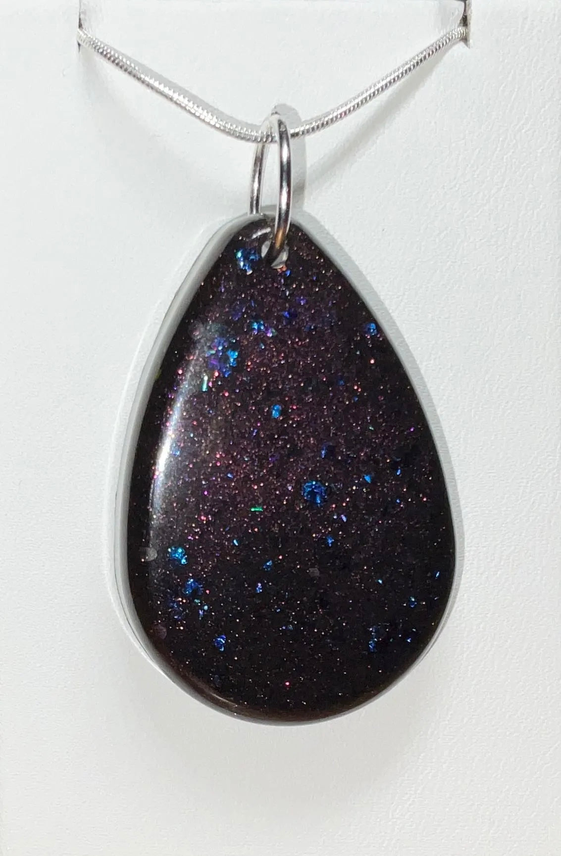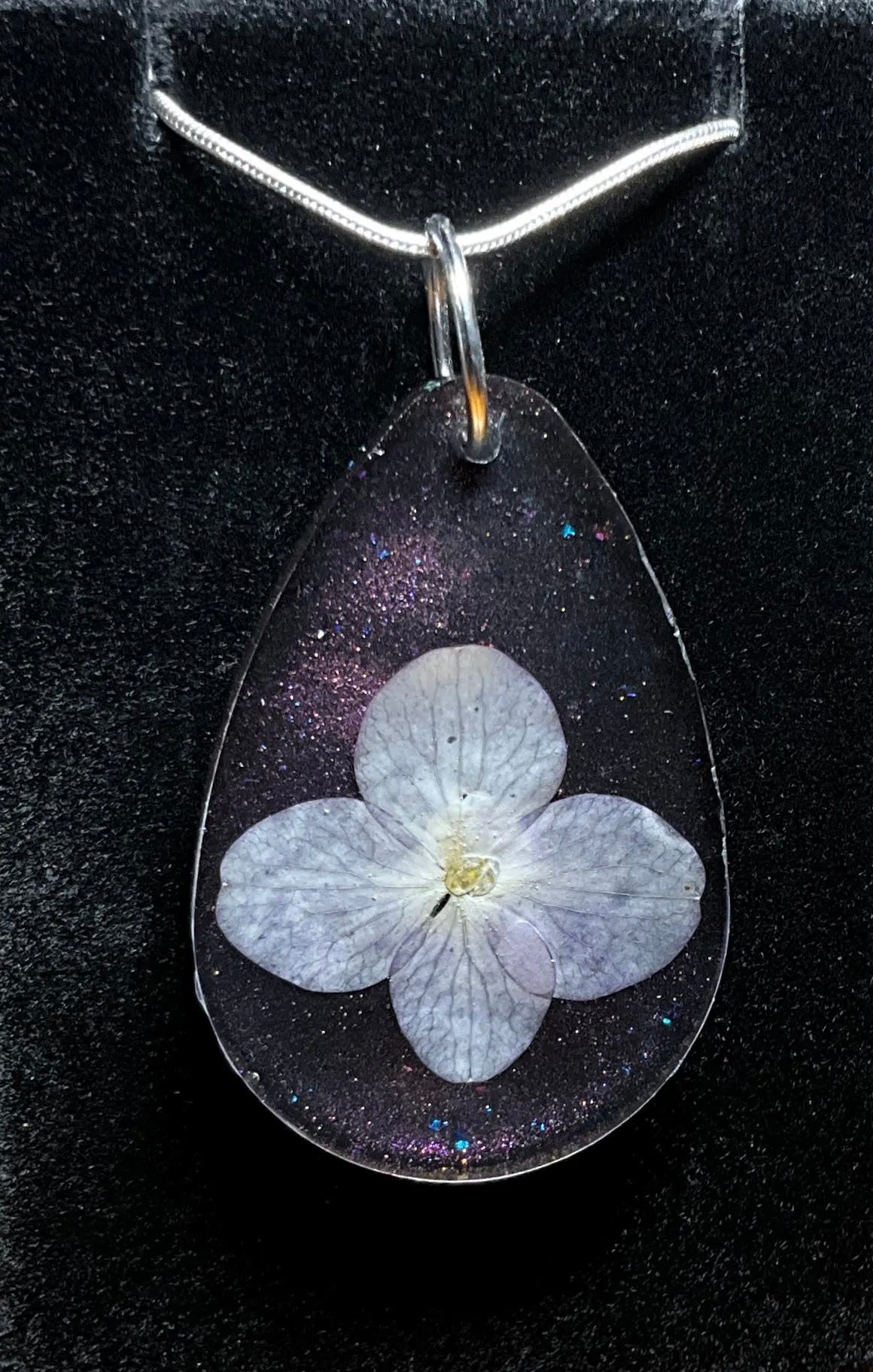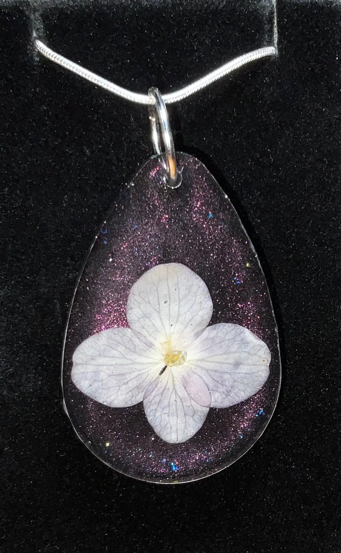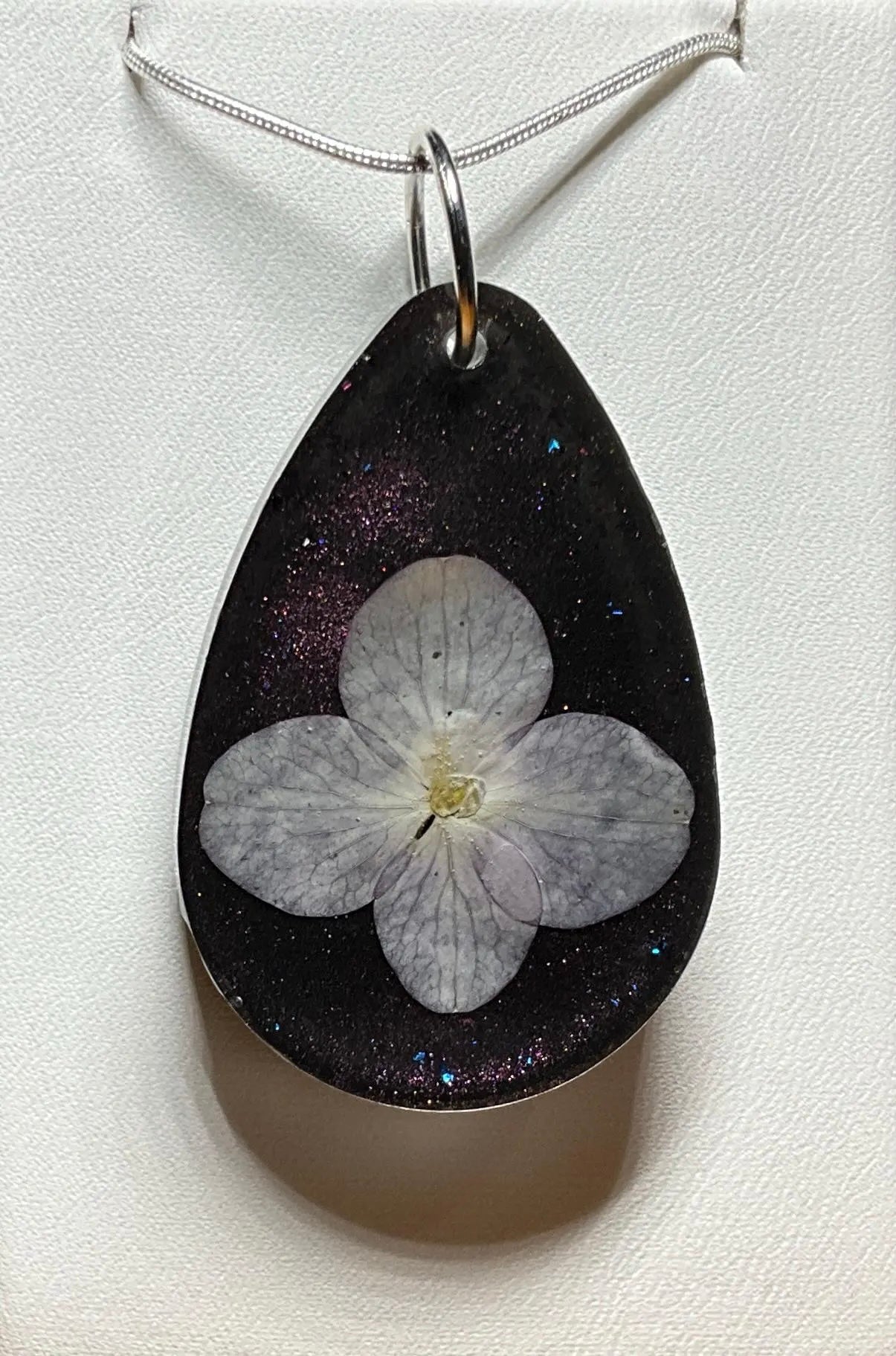 Celebrate the delicate elegance of nature with this stunning two-sided White Hydrangea Flower Necklace. On one side, a soft, white hydrangea flower is set against a deep, shimmering purple backdrop, creating a refined and graceful floral accent. Flip the pendant over to reveal a matching dark purple design, enhanced with metallic flecks of deep blue for a striking, sophisticated touch. This versatile design allows you to switch up your look effortlessly.