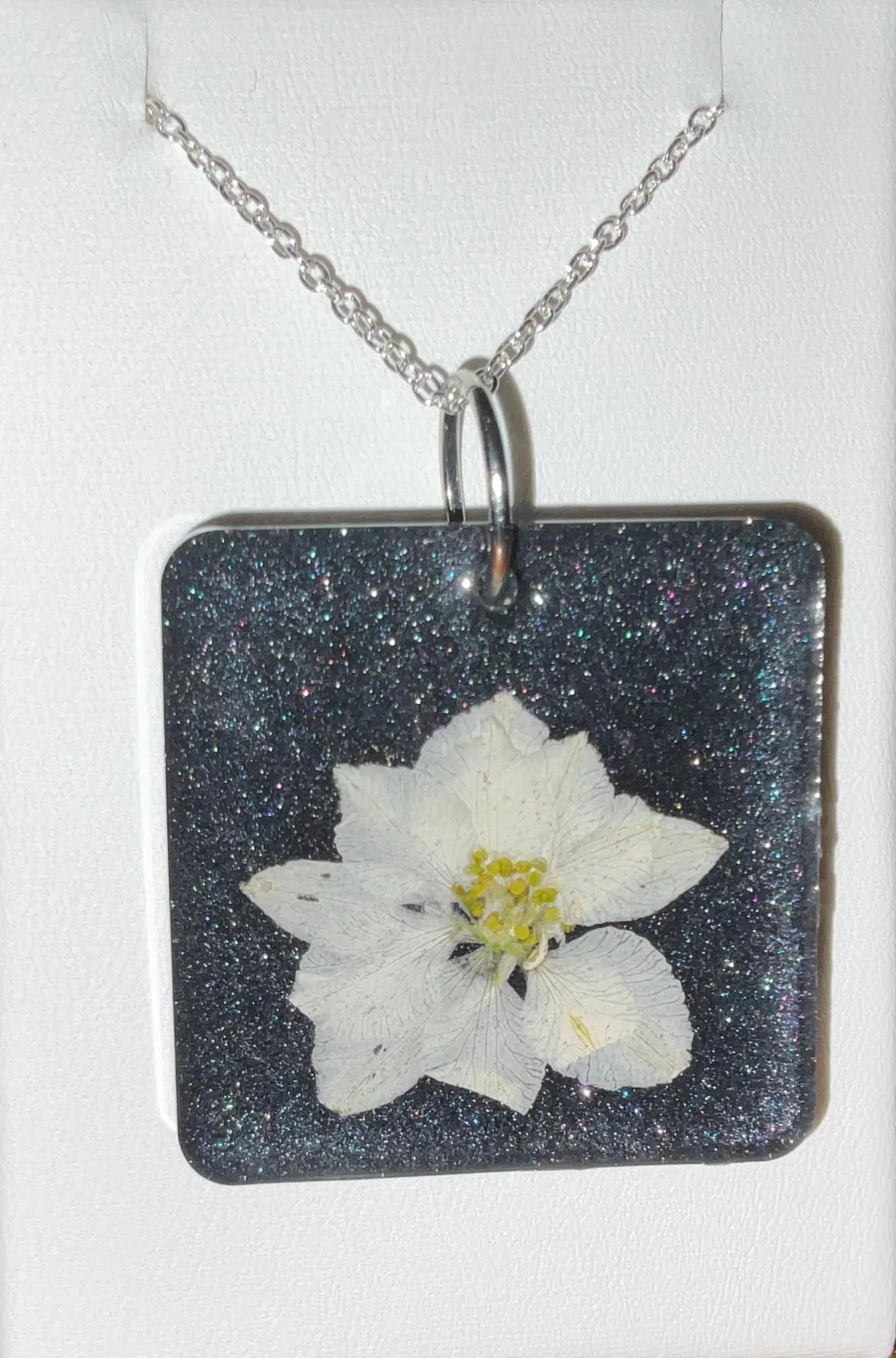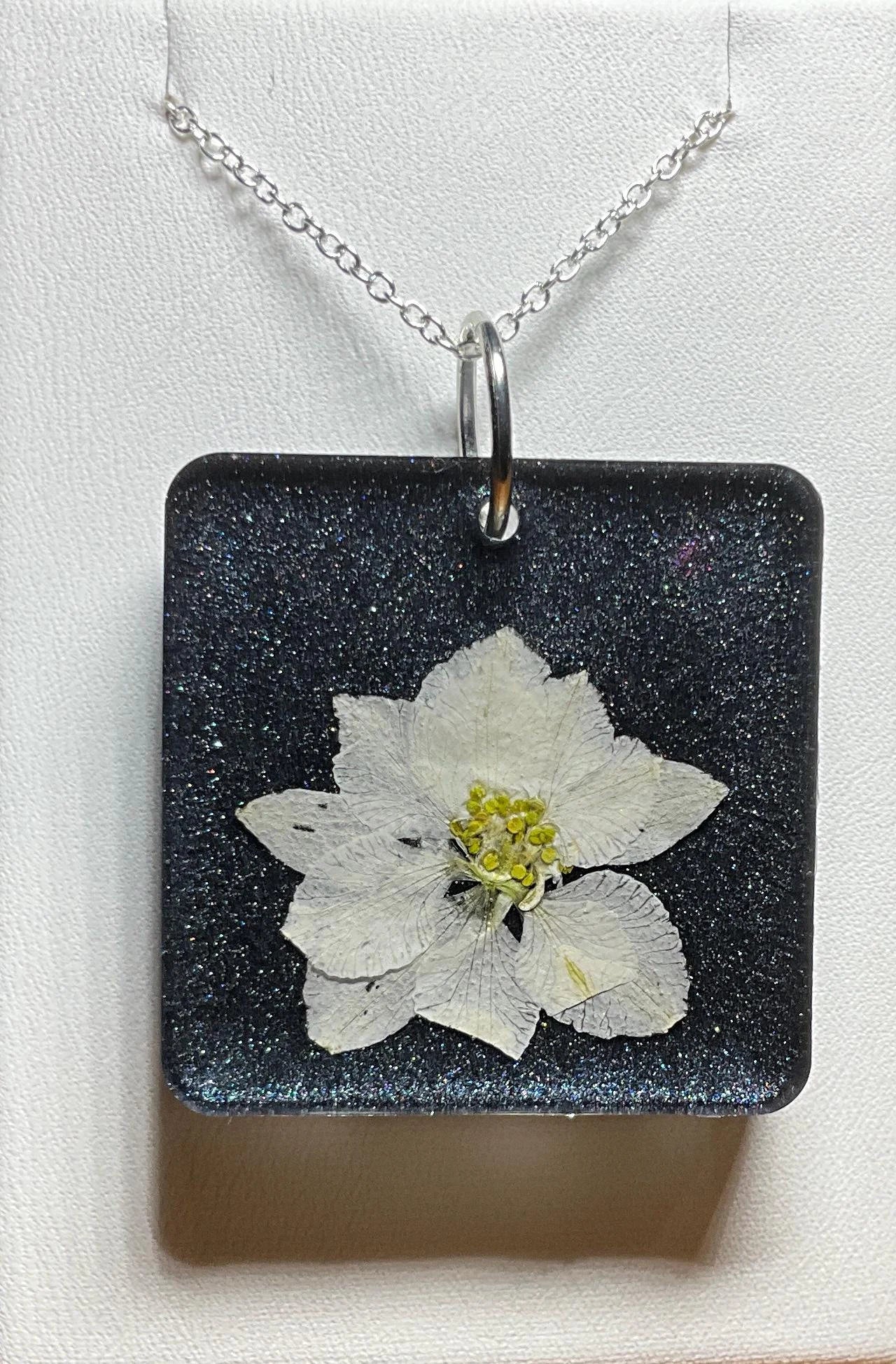Celebrate the timeless beauty of nature with this elegant, two-sided White Larkspur Flower Necklace. One side features a delicate white flower set against a shimmering black backdrop, capturing the essence of natural beauty with a touch of sparkle. Flip the pendant over to reveal a matching, black and pink design that adds versatility, making it the perfect accessory to complement any outfit or mood.